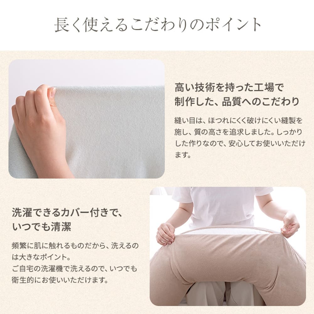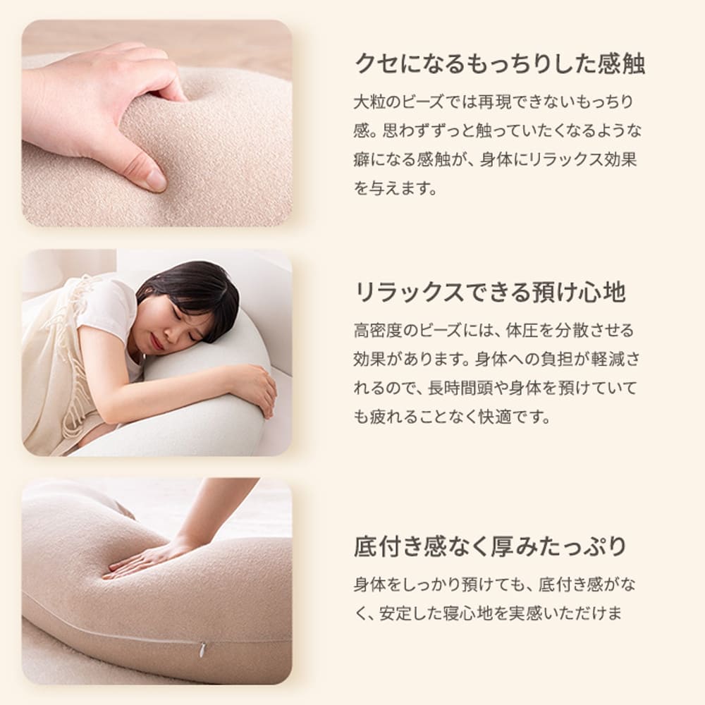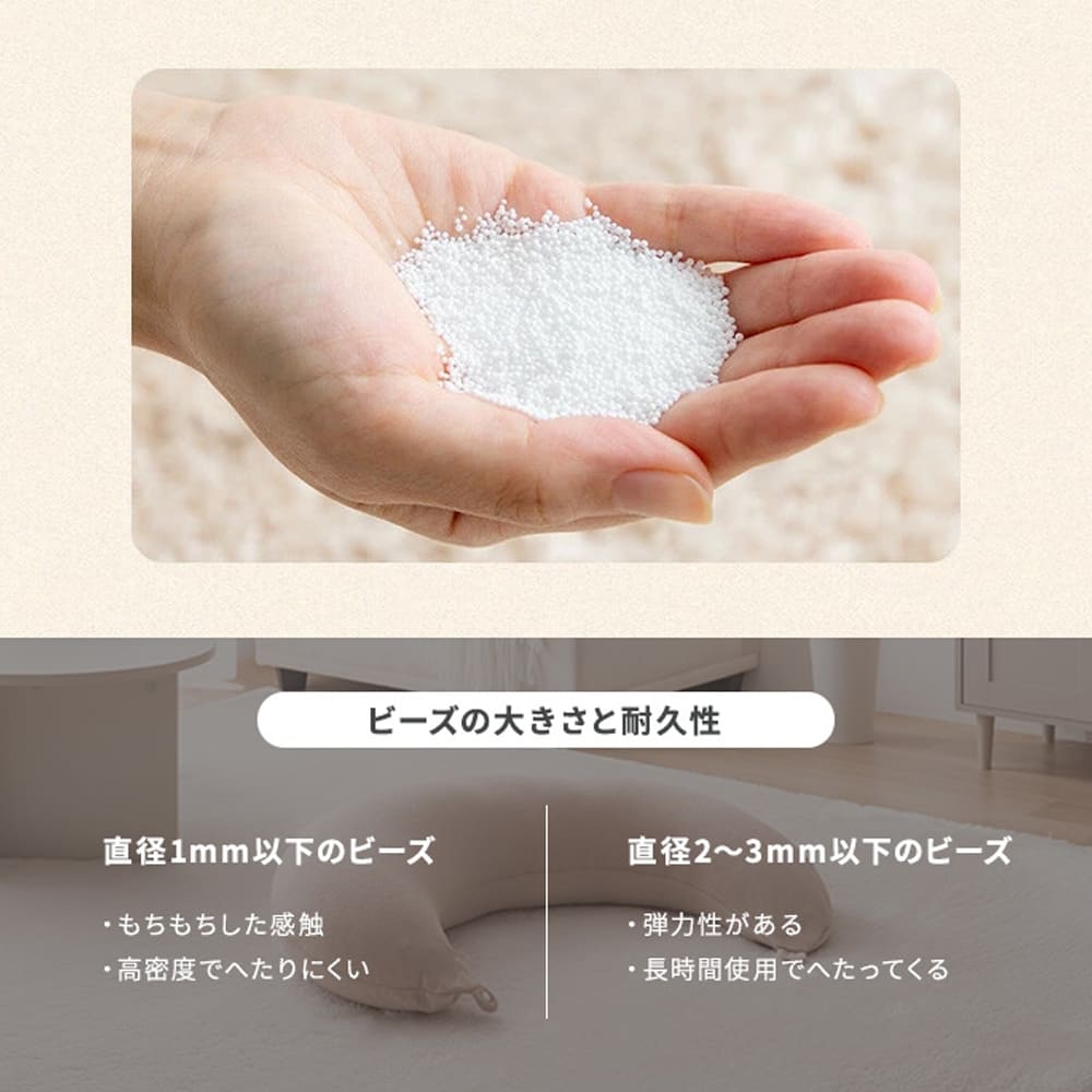 中材には直径1mm以下の極小ビーズをたっぷり使用し、もっちりとした感触と安定したサポート力で快適な使い心地を実現しました。