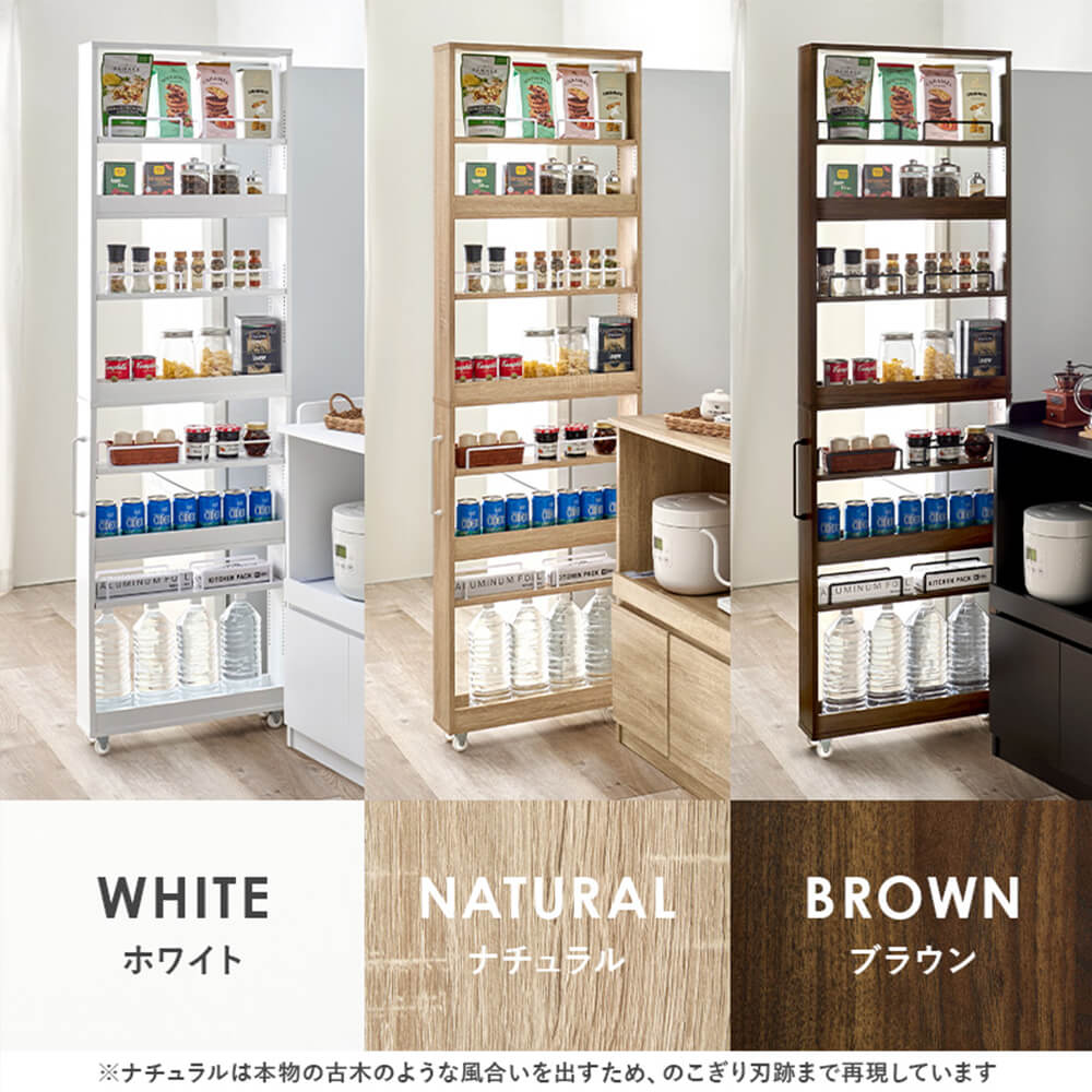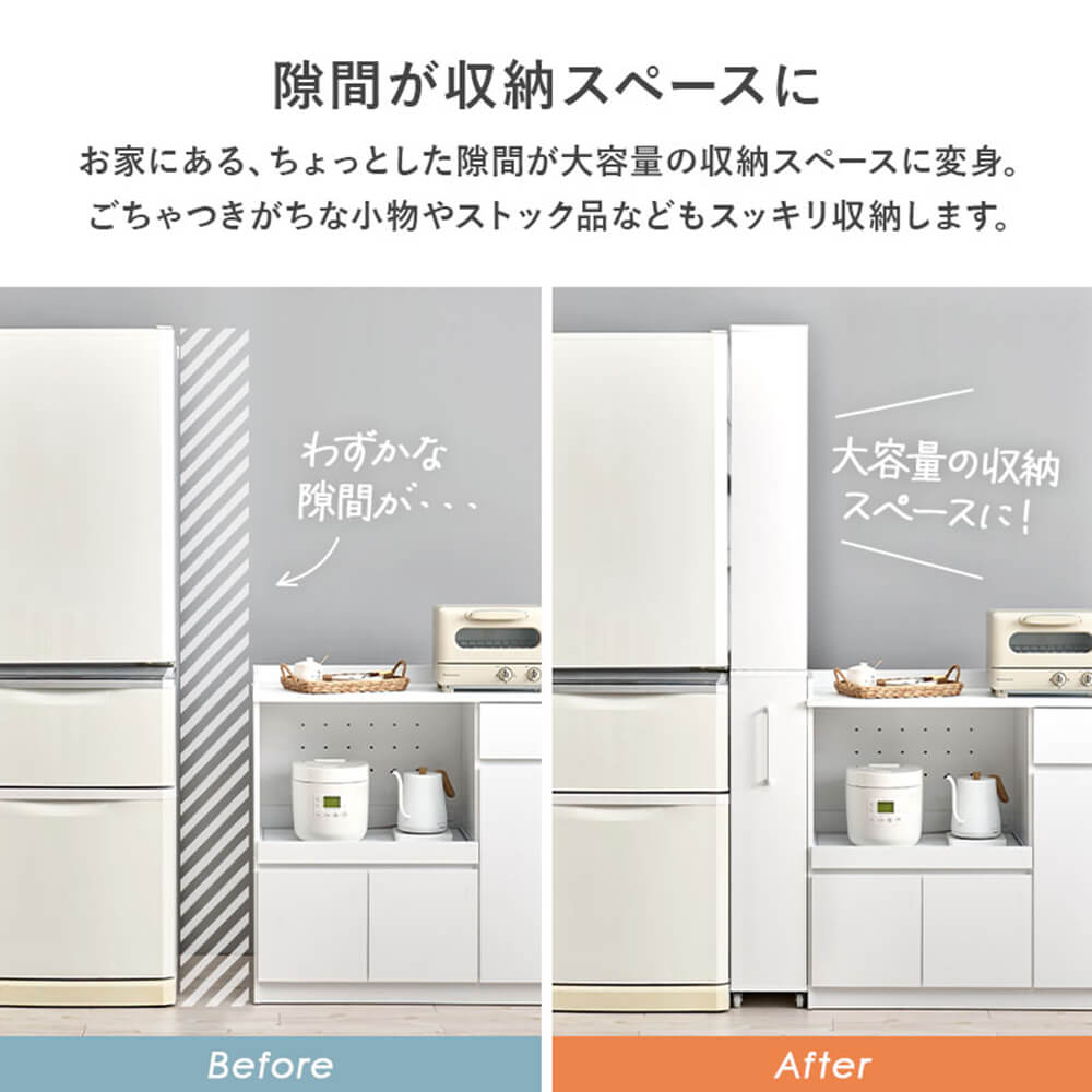 スリム設計のこのワゴンラックは、冷蔵庫横や家具の隙間など、デッドスペースになりがちな場所にもスッキリ収まります。