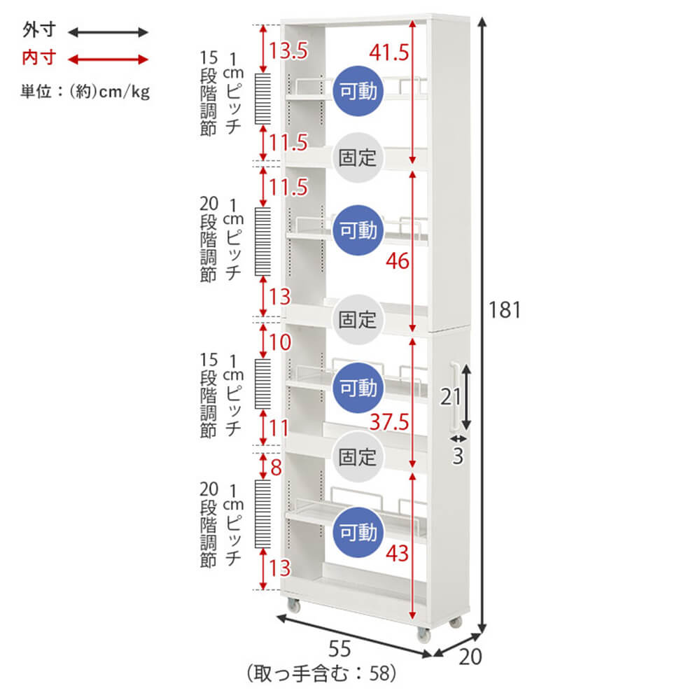 | サイズ(約) | 幅 20cm x 奥行 55cm ( 取手含む : 58cm ) x 高さ 181cm |
