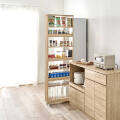 両側から取り出せるオープンタイプで使いやすく、調味料や缶詰、ストック品の収納にぴったりです。取っ手とキャスター付きで引き出しもスムーズだから、必要な時にサッと使えるのもポイント。