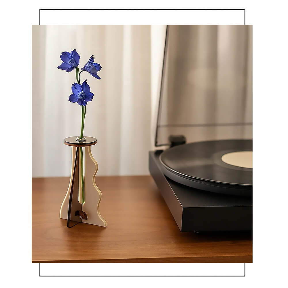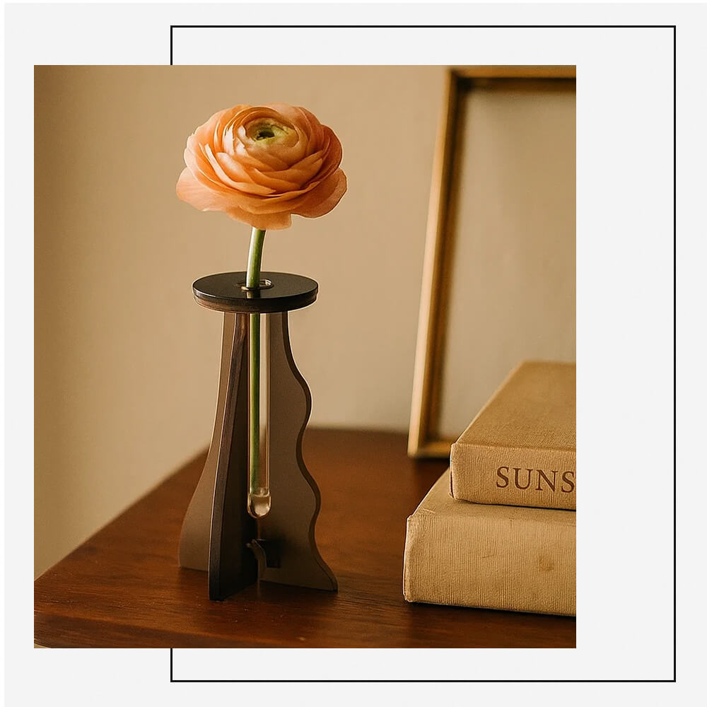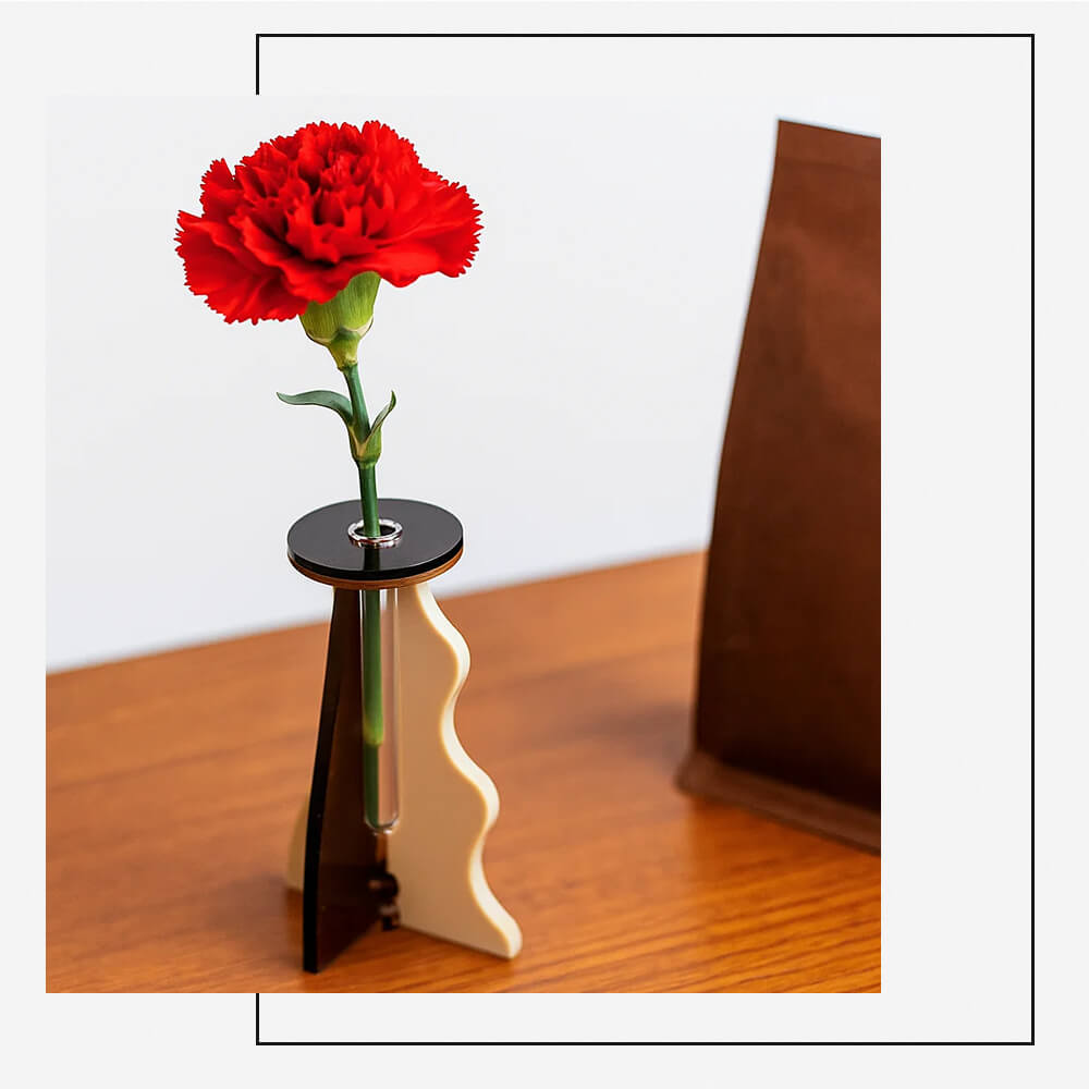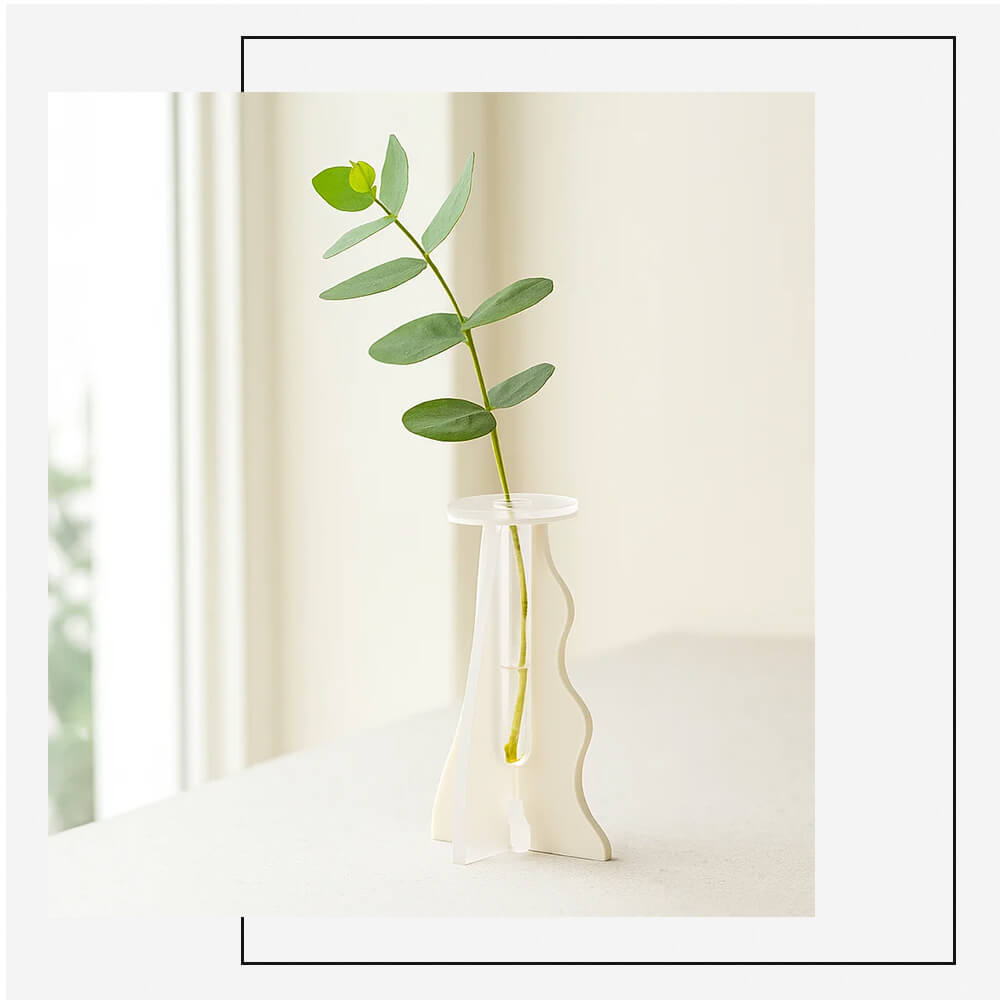 木とアクリルの異素材を組み合わせたユニークな一輪挿しは、飾る花の色や形で雰囲気が変わる楽しいインテリア雑貨。