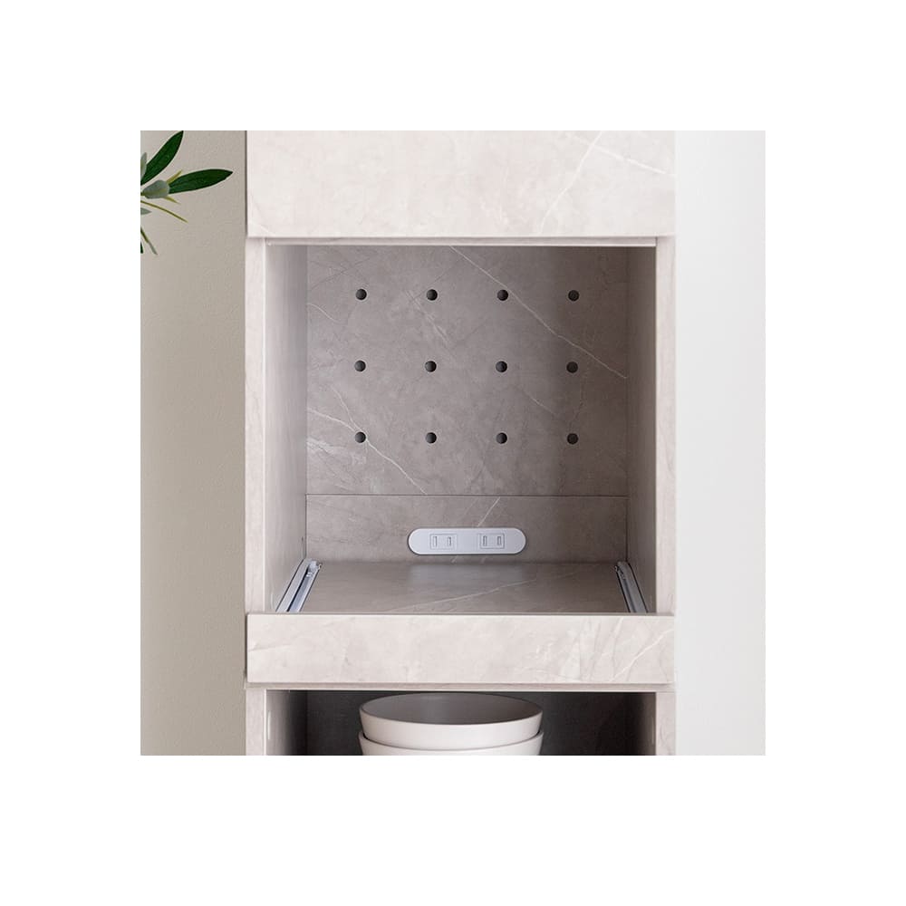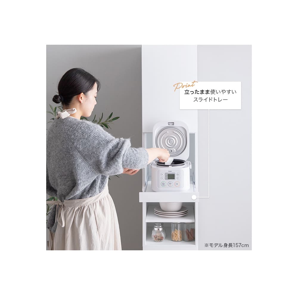スライドトレーは炊飯器やポットを立ったまま楽に操作でき、背面の通気孔と2口コンセントで蒸気や配線の悩みも解決。