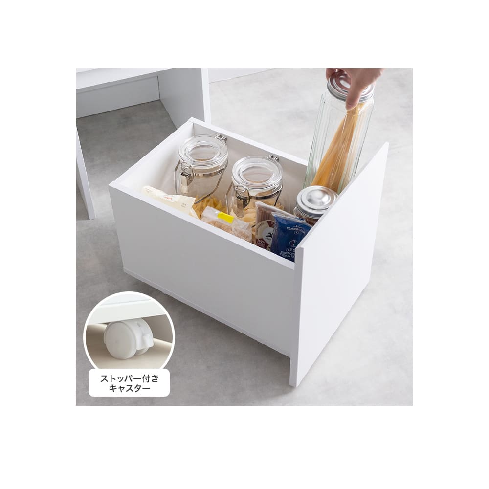 さらに、キャスター付きの深型引き出しはストック食品やゴミ箱としても使えて便利。