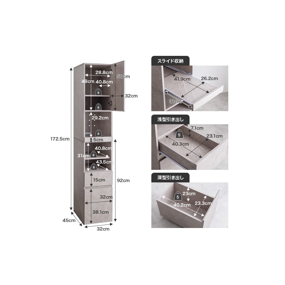 | サイズ(約) | 幅 32cm × 奥行 45cm × 高さ 172.5cm 商品重量 : 約38kg 耐荷重 : 扉収納(可動棚、底板):(各)約8kg、スライドトレー:約8kg、オープン収納(可動棚、底板):(各)約8kg、浅型引き出し:約5kg、深型引き出し:約5kg |