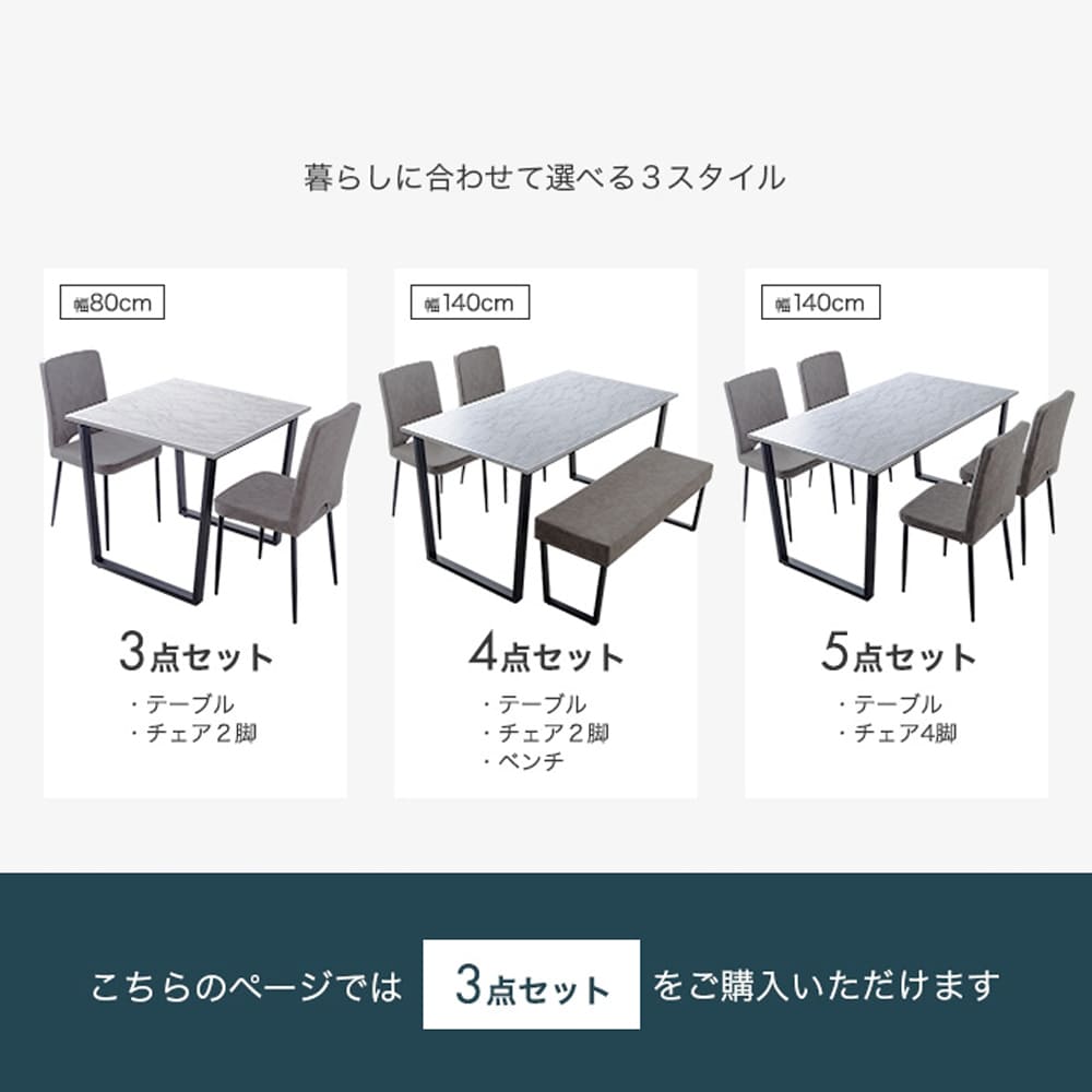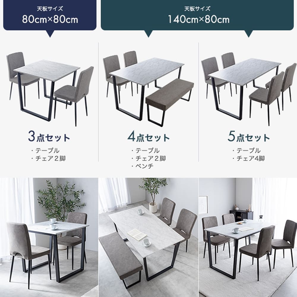 3点セット(テーブル+チェア2脚)、4点セット(テーブル+チェア2脚+ベンチ)、5点セット(テーブル+チェア4脚)の3タイプから選べるので、一人暮らしから家族用まで対応可能。