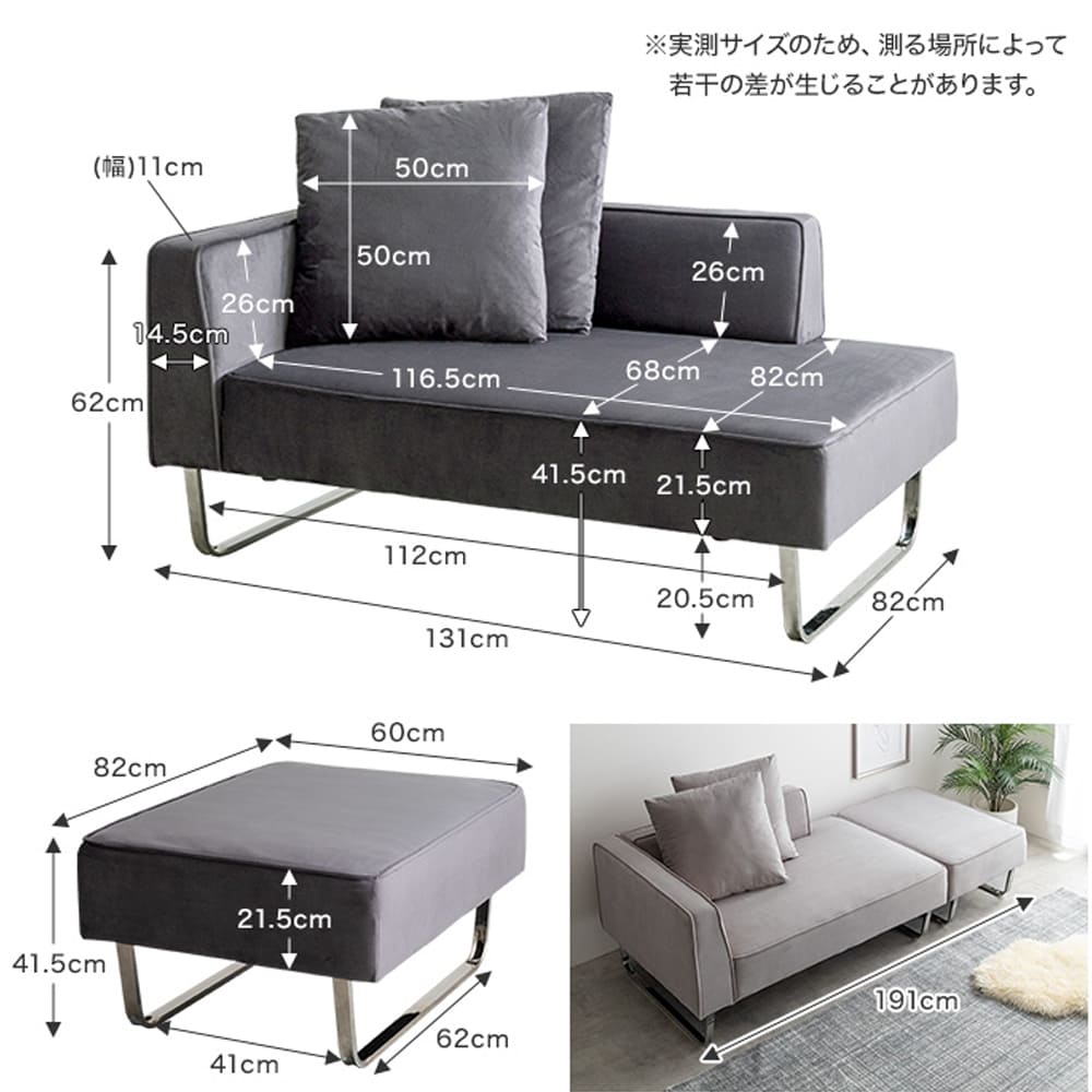 | サイズ(約) | ■ソファ 幅131cm×奥行82cm×高さ62cm(座面高:41.5cm) ■ オットマン 幅82cm×奥行60cm×高さ41.5cm(座面高41.5cm) ■クッション 50cm×50cm |