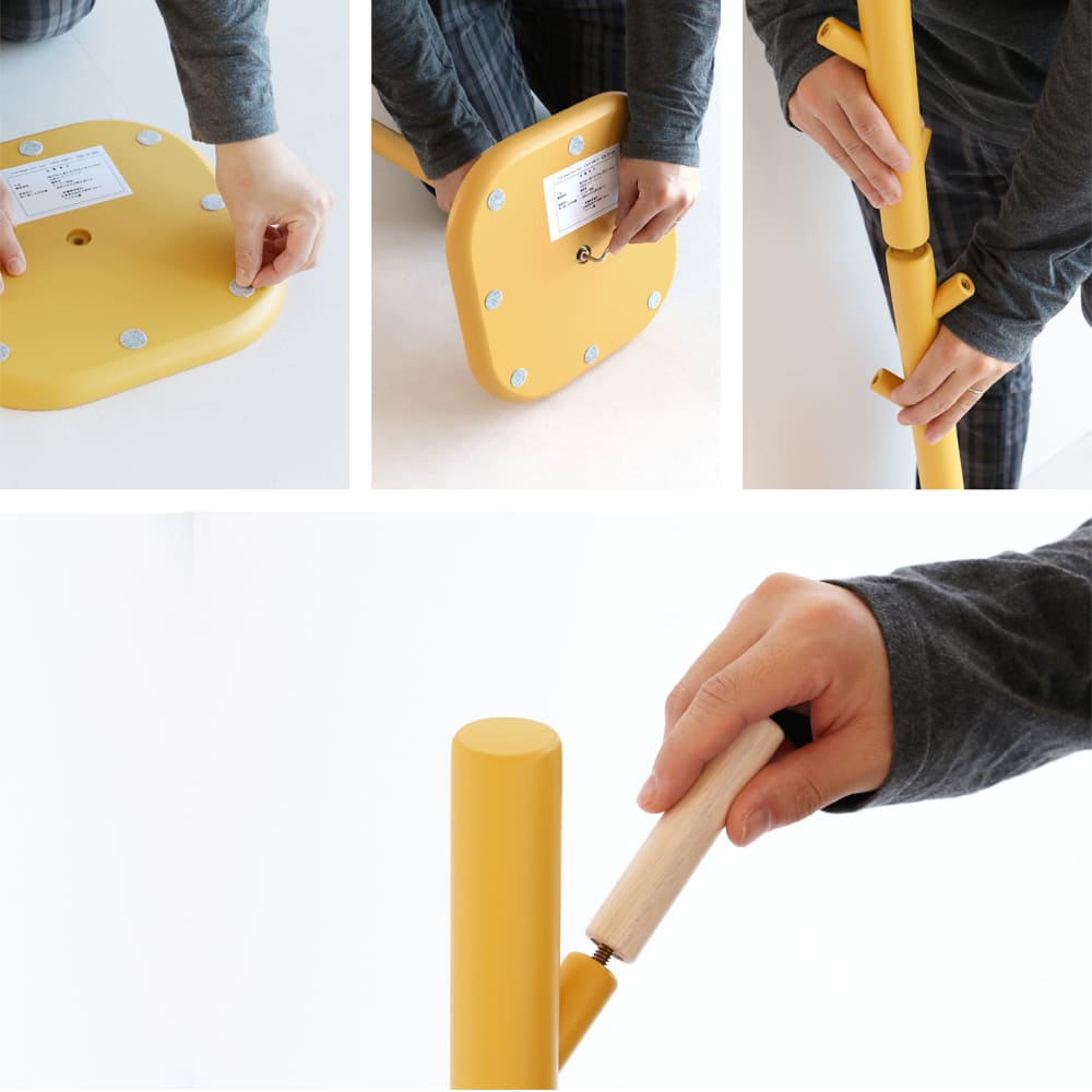 組み立ては支柱とフックを回して取り付けるだけ。工具不要で約15分で完成します。