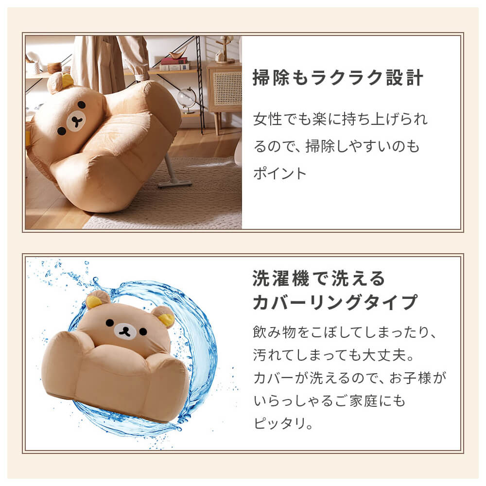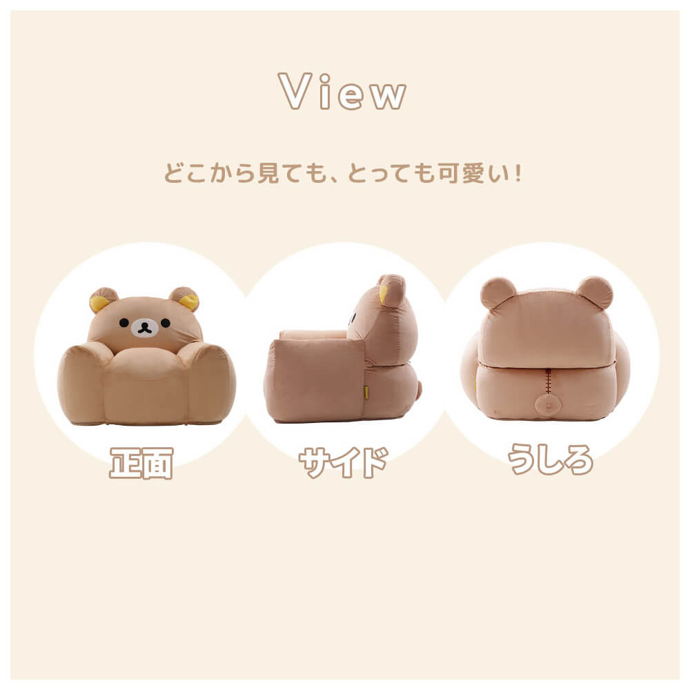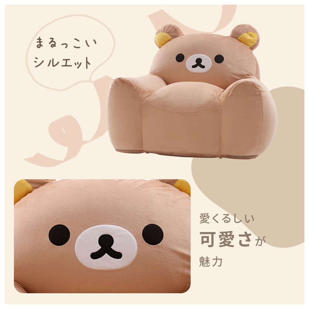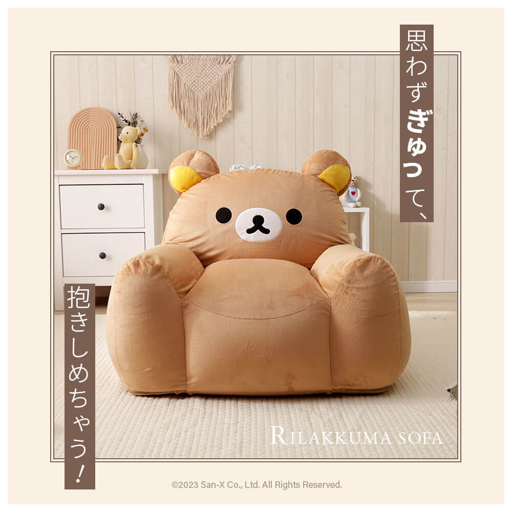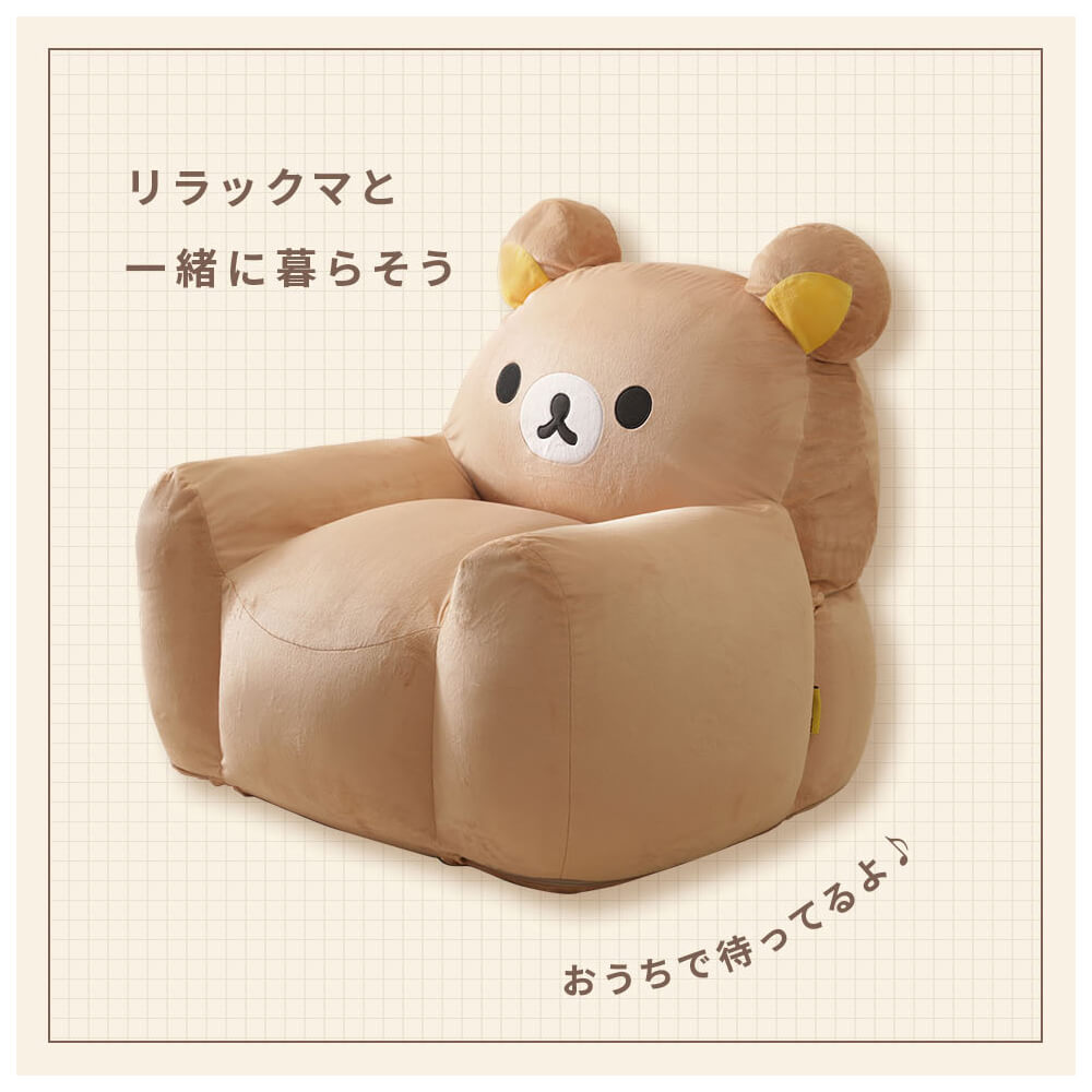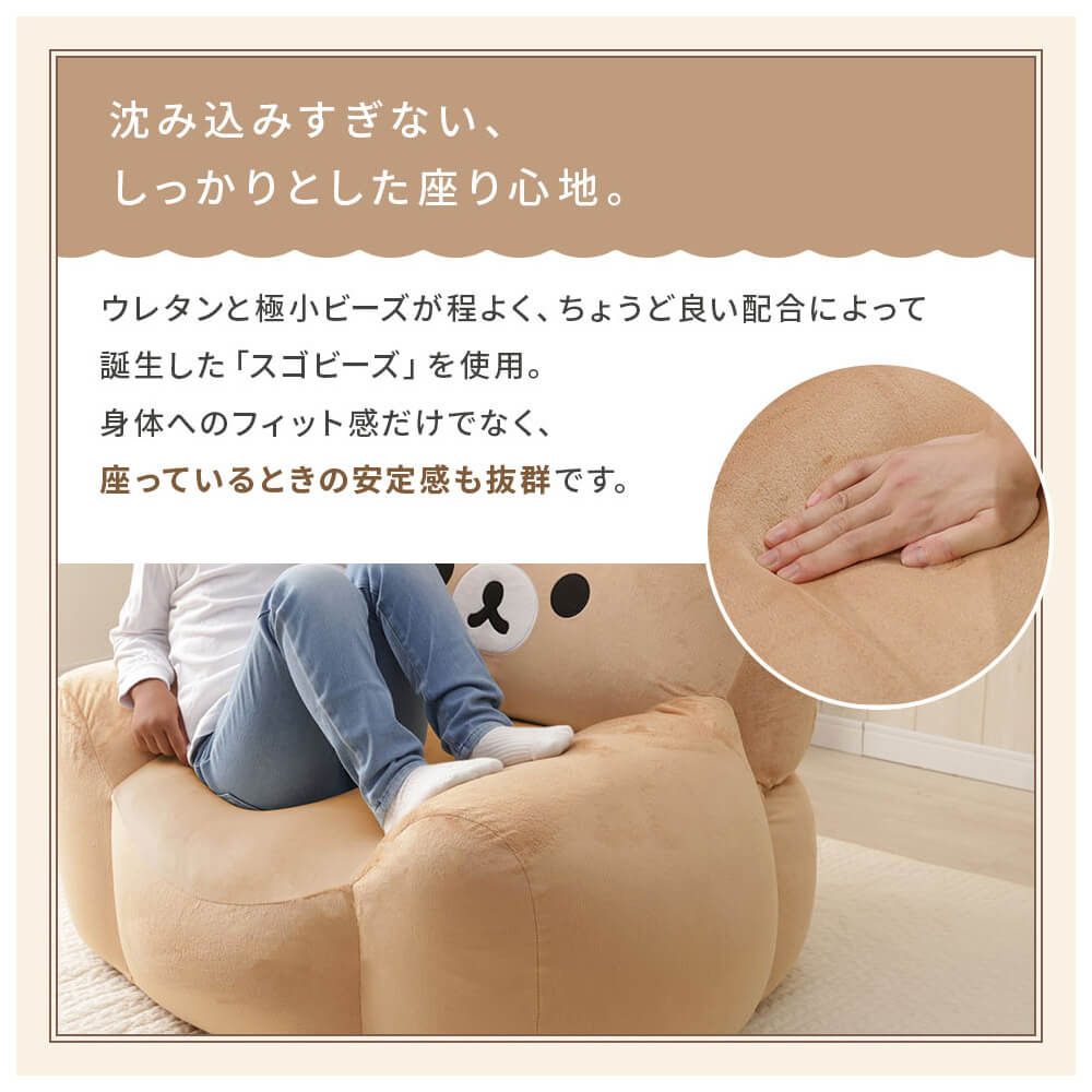 おうち時間がもっと幸せに♪リラックマのかわいいソファは、もちもちでフィット感抜群。特別なビーズ配合「スゴビーズ」で沈み込みすぎず、しっかり座れる安心設計。子ども部屋やリビングに置くだけで癒しの空間に早変わり!後ろ姿もぬいぐるみみたいにキュートで、思わずぎゅっとしたくなるインテリア雑貨です。