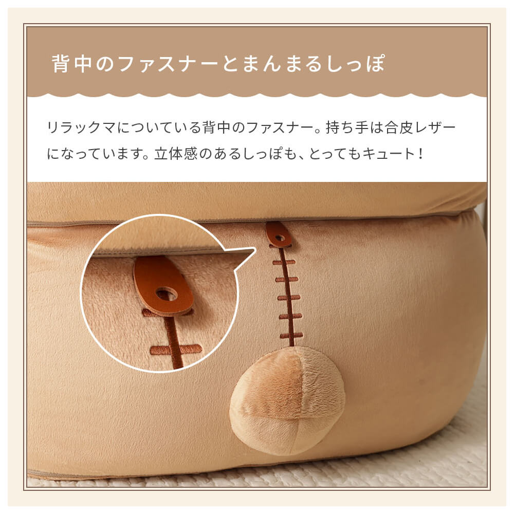 背中にはリラックマらしいファスナーの刺しゅう模様と合皮レザーの持ち手付き。まんまるのしっぽも立体的で、後ろ姿までぬいぐるみのような可愛さ。子どもから大人まで笑顔になれる癒し系インテリアとして、お部屋をほっこり彩ります。