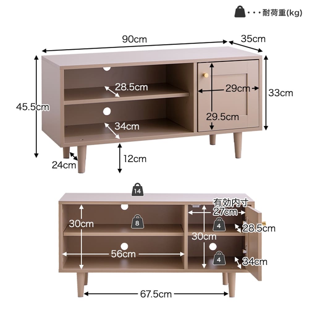 | サイズ(約) | ■本体サイズ 幅90cm×奥行35cm×高さ45.5cm ■商品重量 14.5kg ■耐荷重 天板:約14kg 棚板(オープン収納):約8kg 棚板(扉収納):約4kg 底板(扉収納):約4kg |