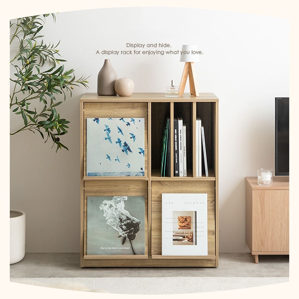 フラップ扉には雑誌やレコードを飾れて、開けたままでも使える実用性も抜群。