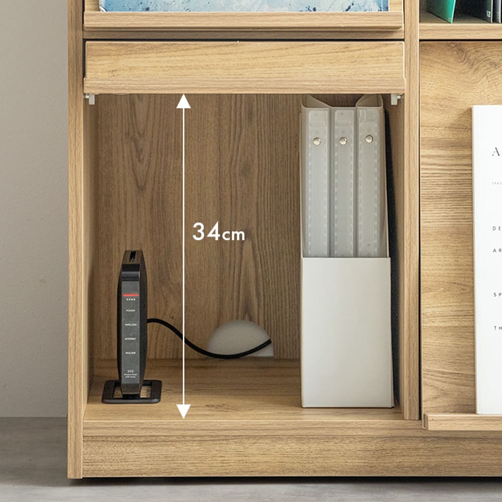 34cmの高さがある収納スペースにはA4ファイルやWi-Fiルーターなどもしっかり収まり、背面のコード穴で配線もすっきり。