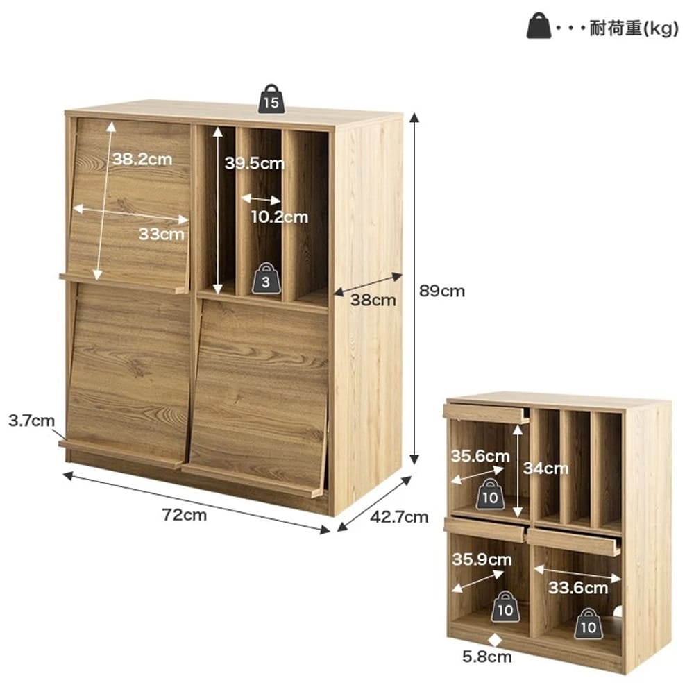 | サイズ(約) | ■本体サイズ 幅72cm×奥行42.7cm×高さ89cm ■商品重量:約27.4kg ■耐荷重:天板:約15kg、フラップ扉内収納底板:(各)約10kg、スリット収納底板:(各)約3kg |