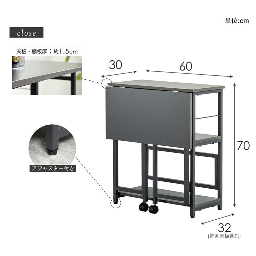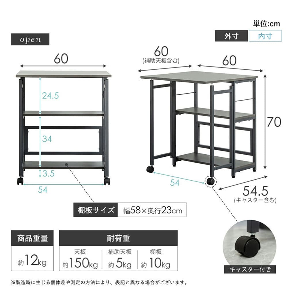 | サイズ(約) | 補助天板折りたたみ時: 幅 60cm × 奥行 30cm × 高さ 70cm 補助天板展開時: 幅 60cm × 奥行 60cm × 高さ 70cm 商品重量: 約 12kg 耐荷重: 天板 約150kg、棚板 約15kg、補助天板 約5kg |