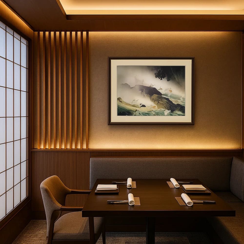 反射なくどの角度からも作品の質感を楽しんでいただくため、前面のアクリル板をあえてつけない、海外美術館のスタイル。