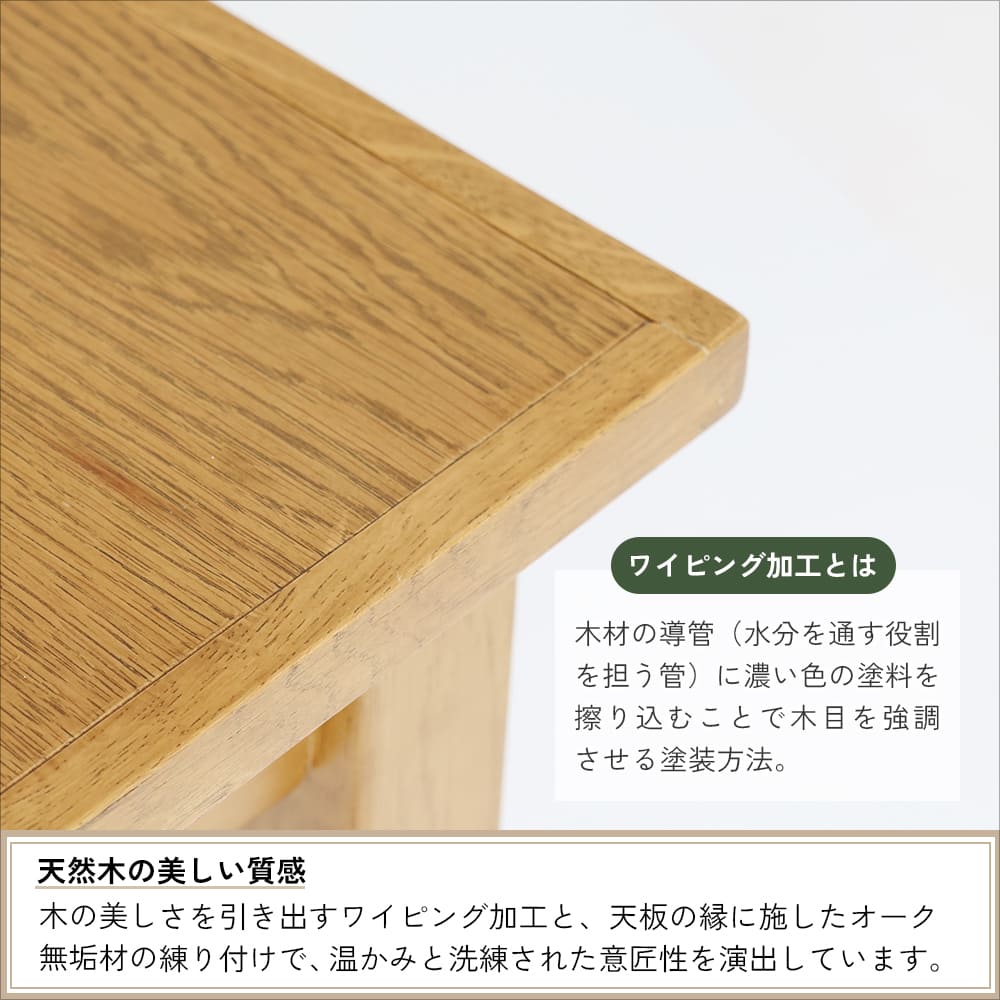 天板には木目を引き立てるワイピング加工が施されており、あたたかみと上品さを兼ね備えています。