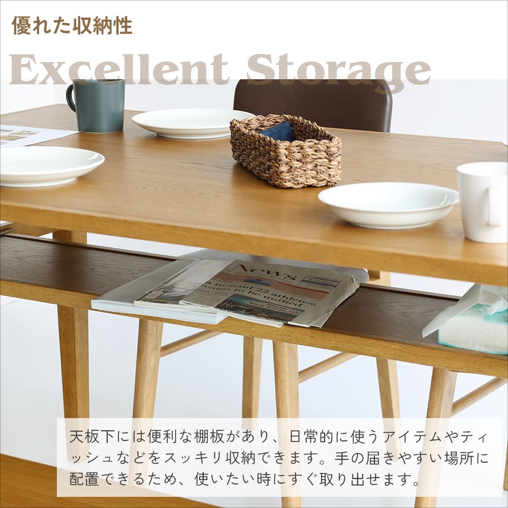 天板の下には便利な棚板付きで、新聞やティッシュなど日常使いの小物をスッキリ収納できます。