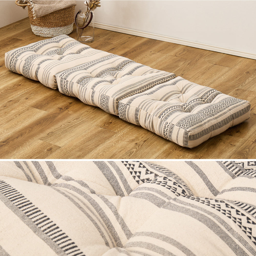 3つ折り仕様なので、広げてごろ寝マットやお昼寝まくらに、折り曲げて背もたれ付きの座椅子やクッション代わりにも使えます。