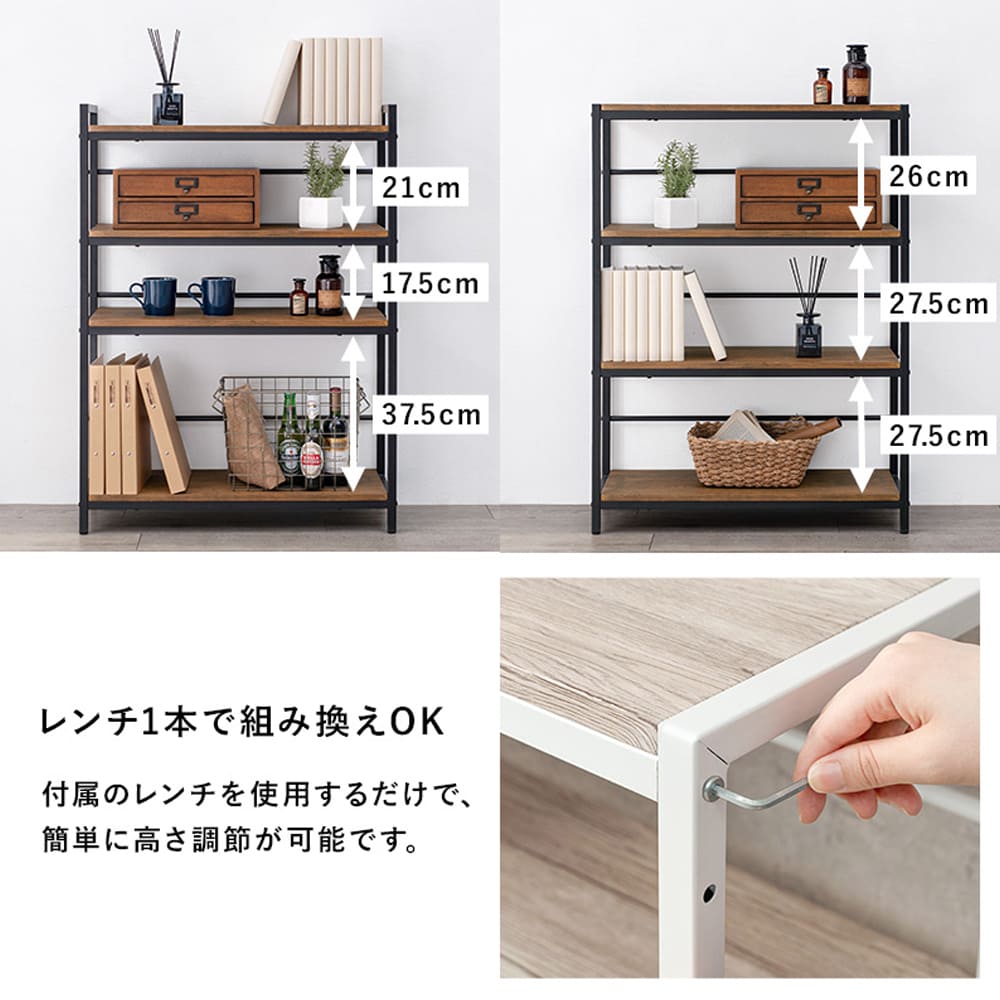 付属のレンチで棚の高さも簡単に調整できるので、引っ越しや模様替えにも便利です。
