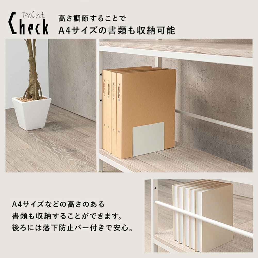 棚板は2段階・3段階で高さ調節が可能で、A4サイズの書類や雑貨、衣類など高さの異なるアイテムも無理なく収納できます。
