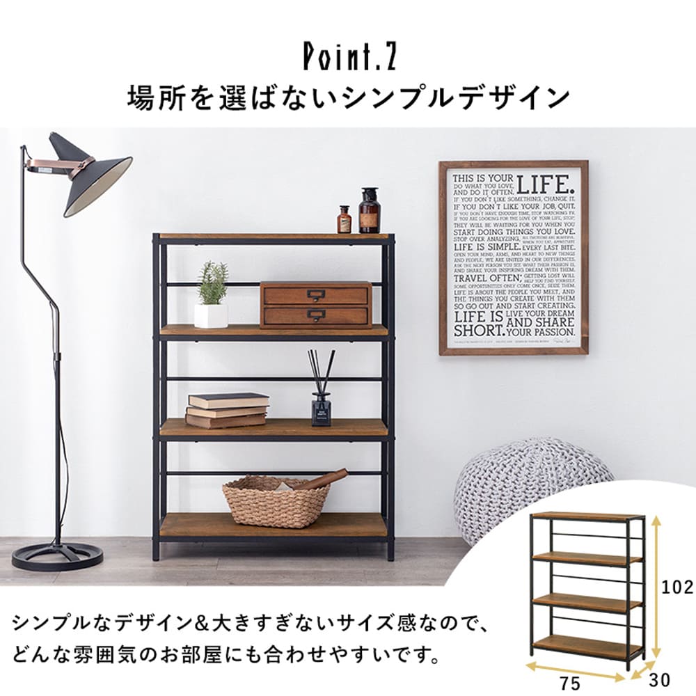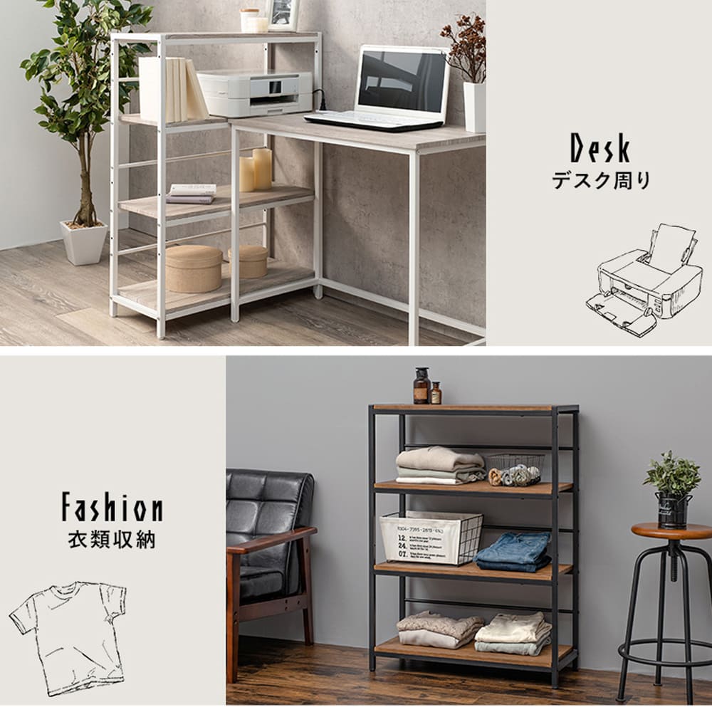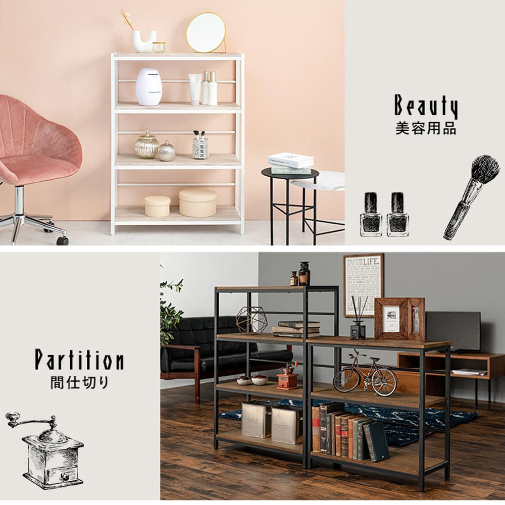 リビングでのインテリア収納、デスク周りの整理整頓、美容用品のディスプレイや衣類収納、さらにはパーテーション代わりとしても活躍します。