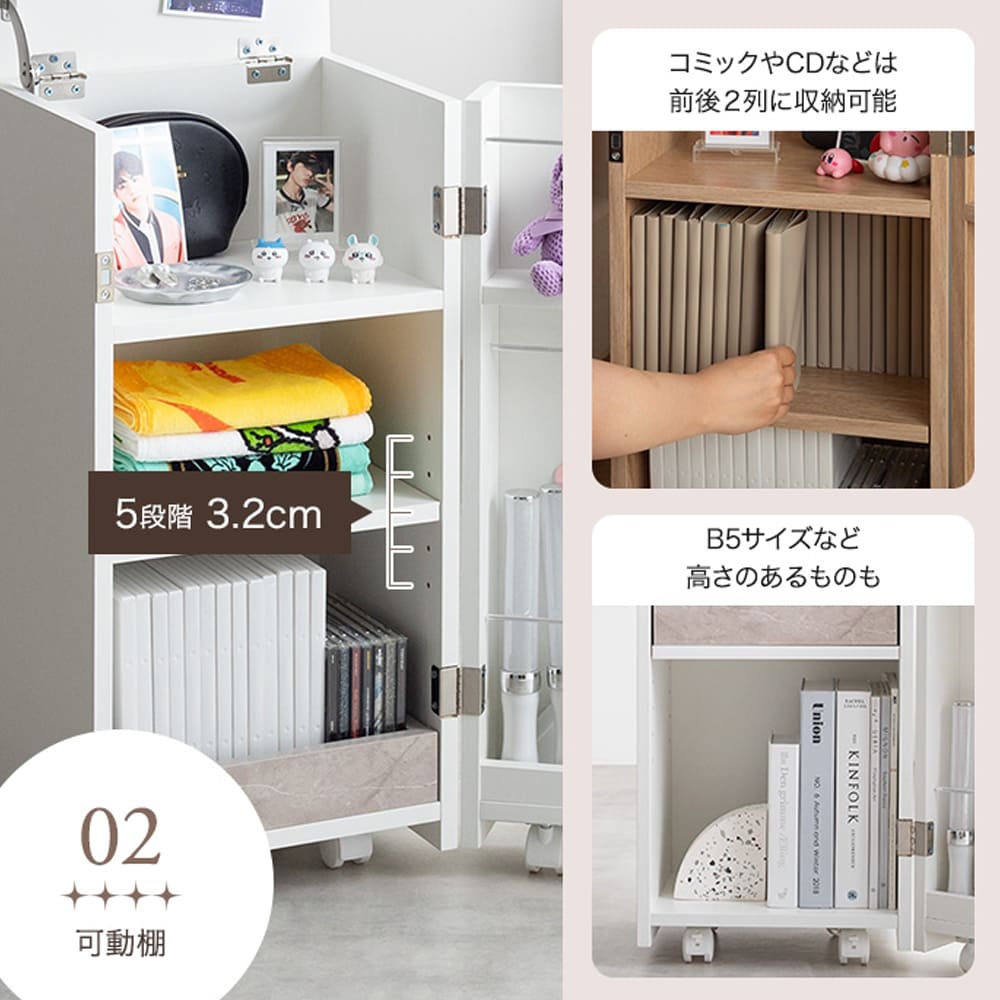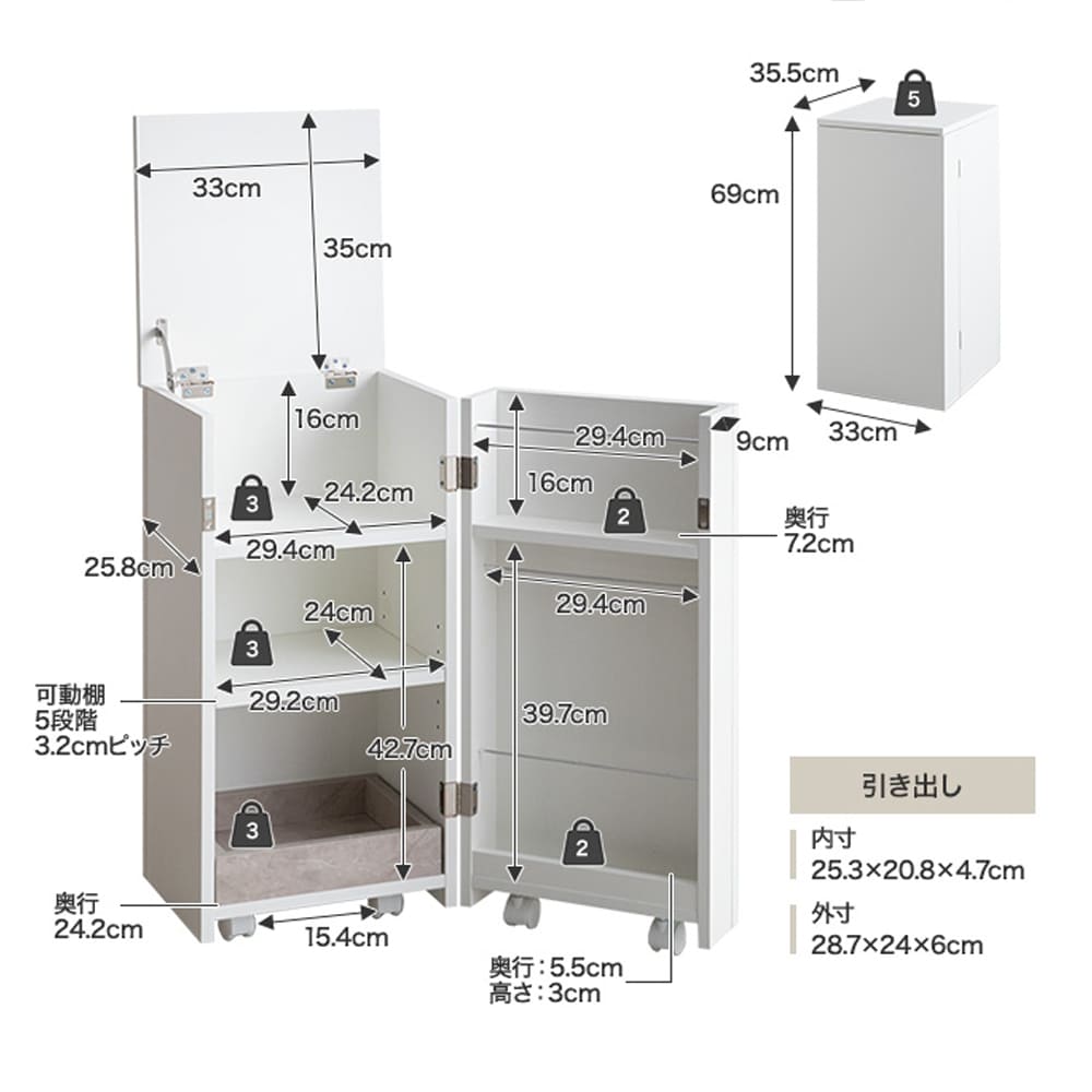 | サイズ(約) | ■本体サイズ 幅33cm×奥行35.5cm×高さ69cm ■商品重量 約15.3kg ■耐荷重 天板:約5kg 固定棚(ワイド):約3kg、固定棚(スリム):約2kg 可動棚:約3kg 底板(ワイド):約3kg、底板(スリム):約2kg |