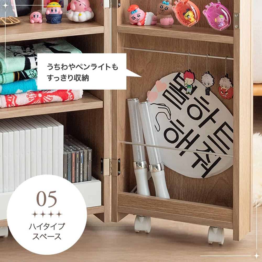 アクスタやプロマイド、うちわ、ペンライトなどを飾って楽しめる5つの収納スペース付き。