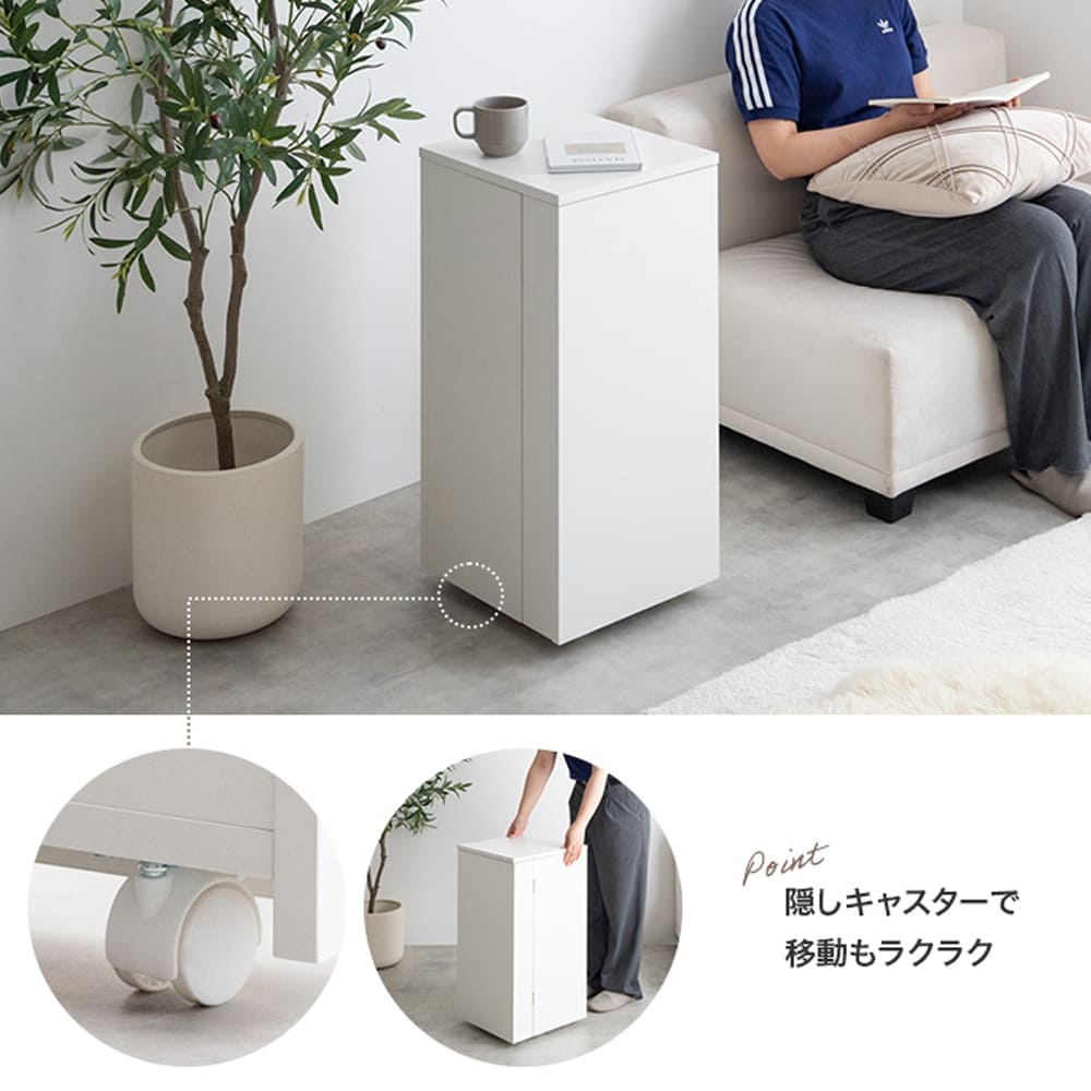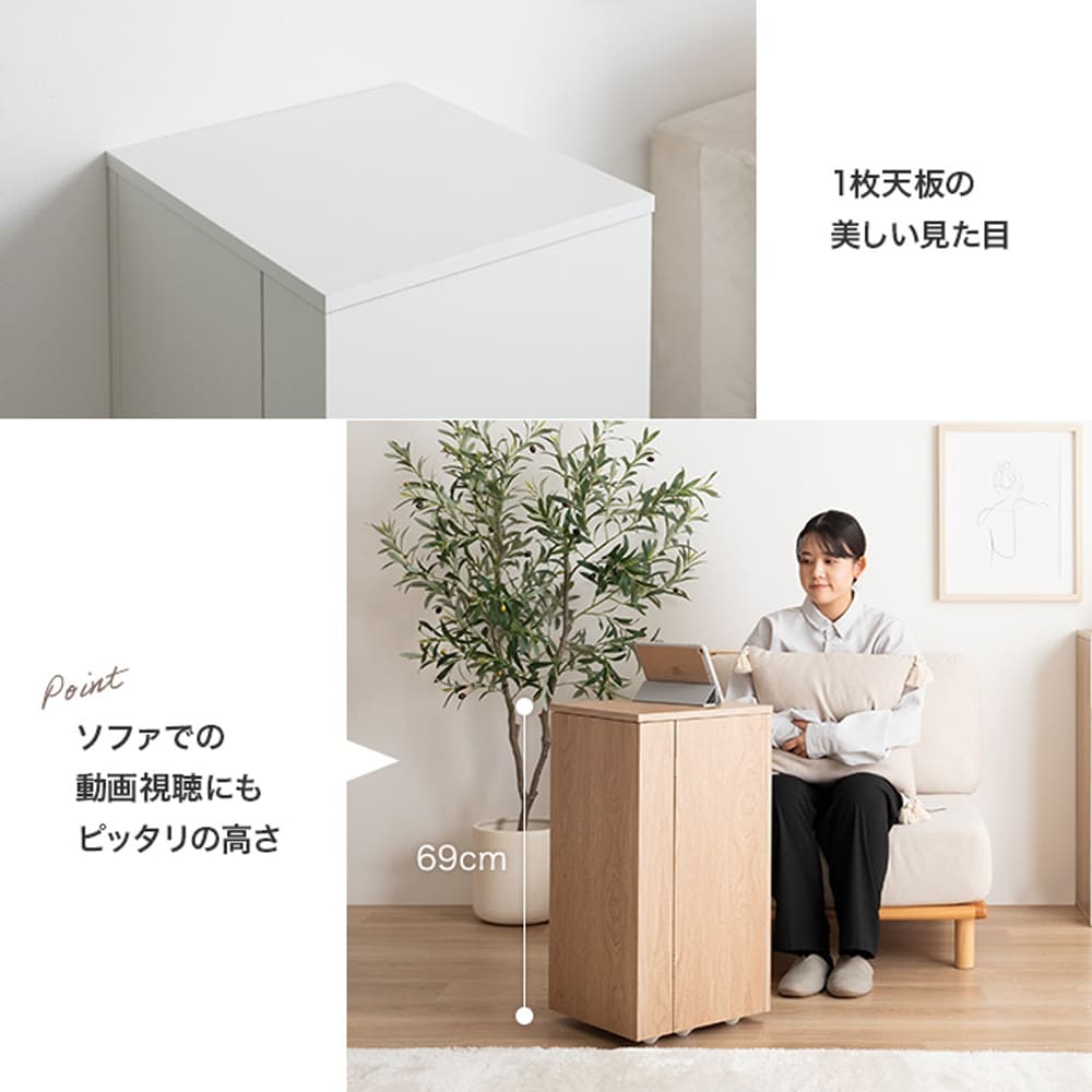 使わないときは扉を閉じればシンプルなサイドテーブルとしてインテリアに自然になじみ、リビングや寝室でもおしゃれに使えます。