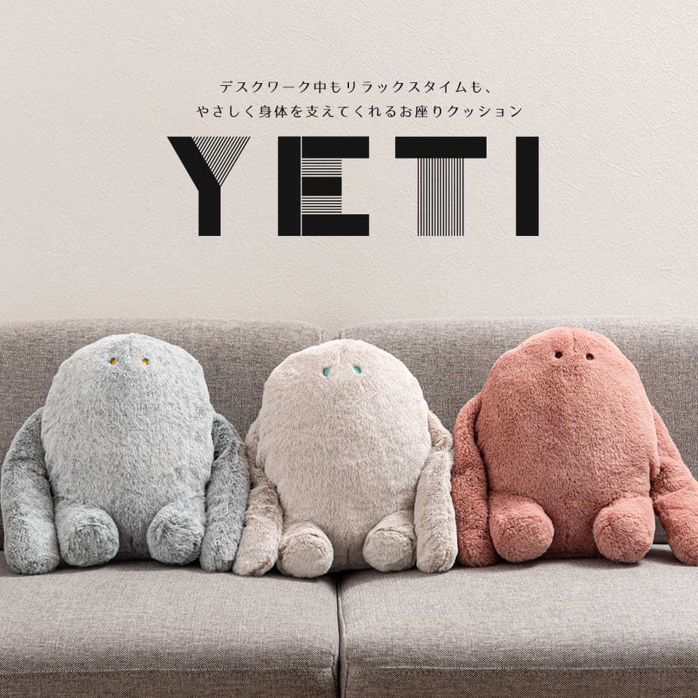 仕事の合間も、くつろぎ時間も。あなたのそばでやさしく支える癒し系クッション「YETI(イエティ)」。愛らしい姿とふわふわの肌ざわりで、お部屋に心地よいぬくもりをプラス。姿勢サポートもぬくもりも、これひとつで。