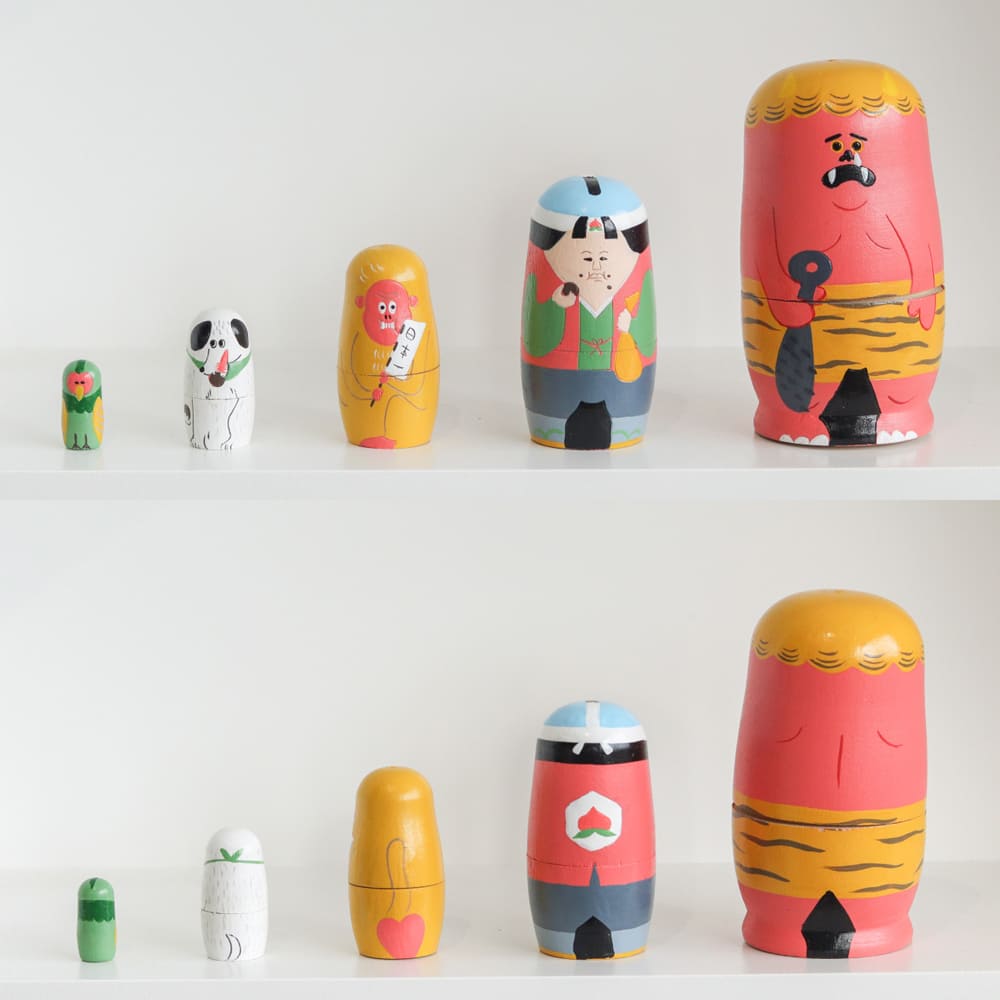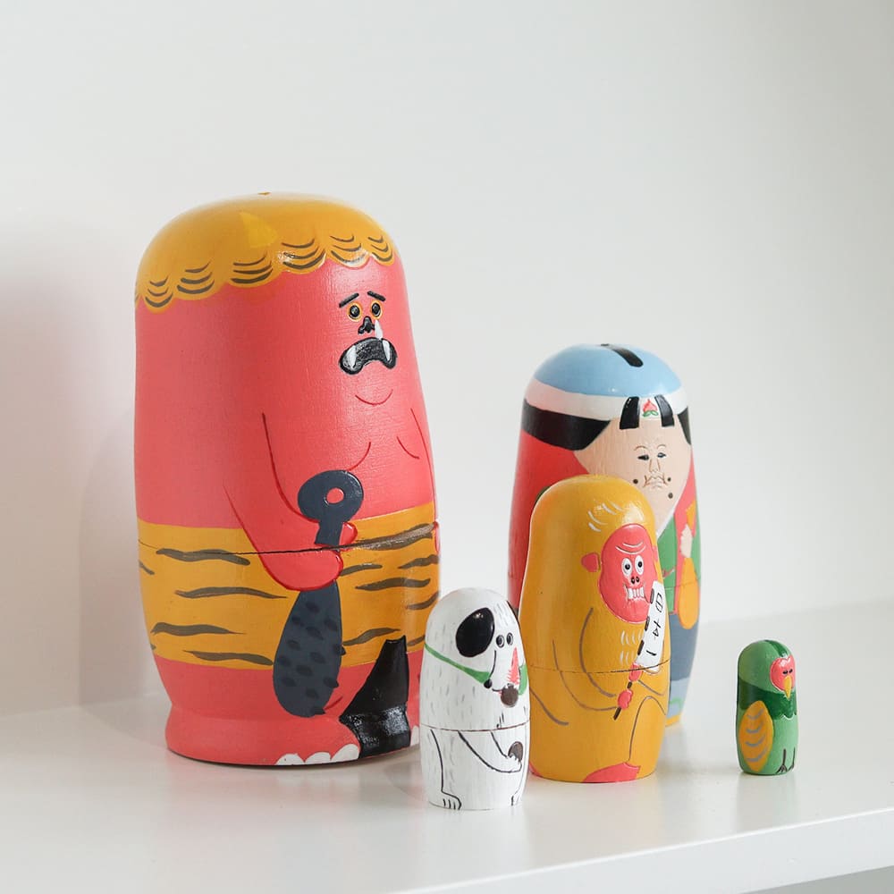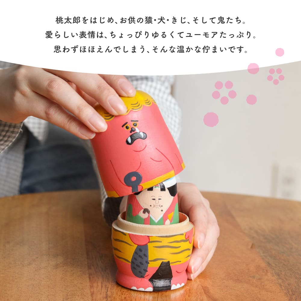 昔話「ももたろう」の登場人物たちが、カラフルでかわいい木製マトリョーシカになって登場。