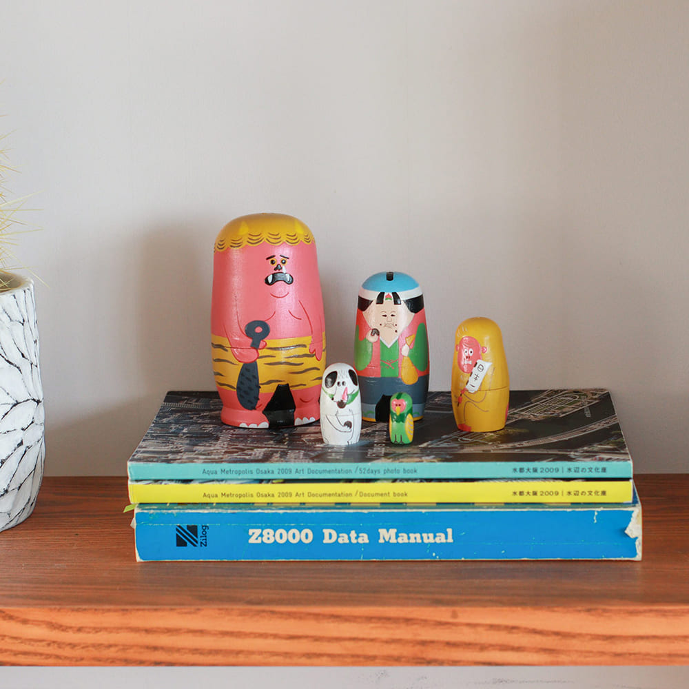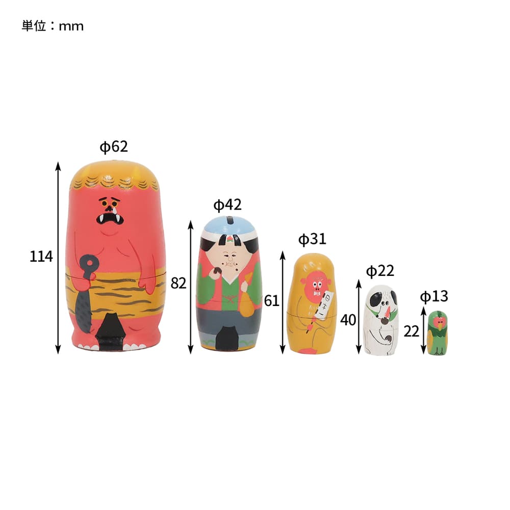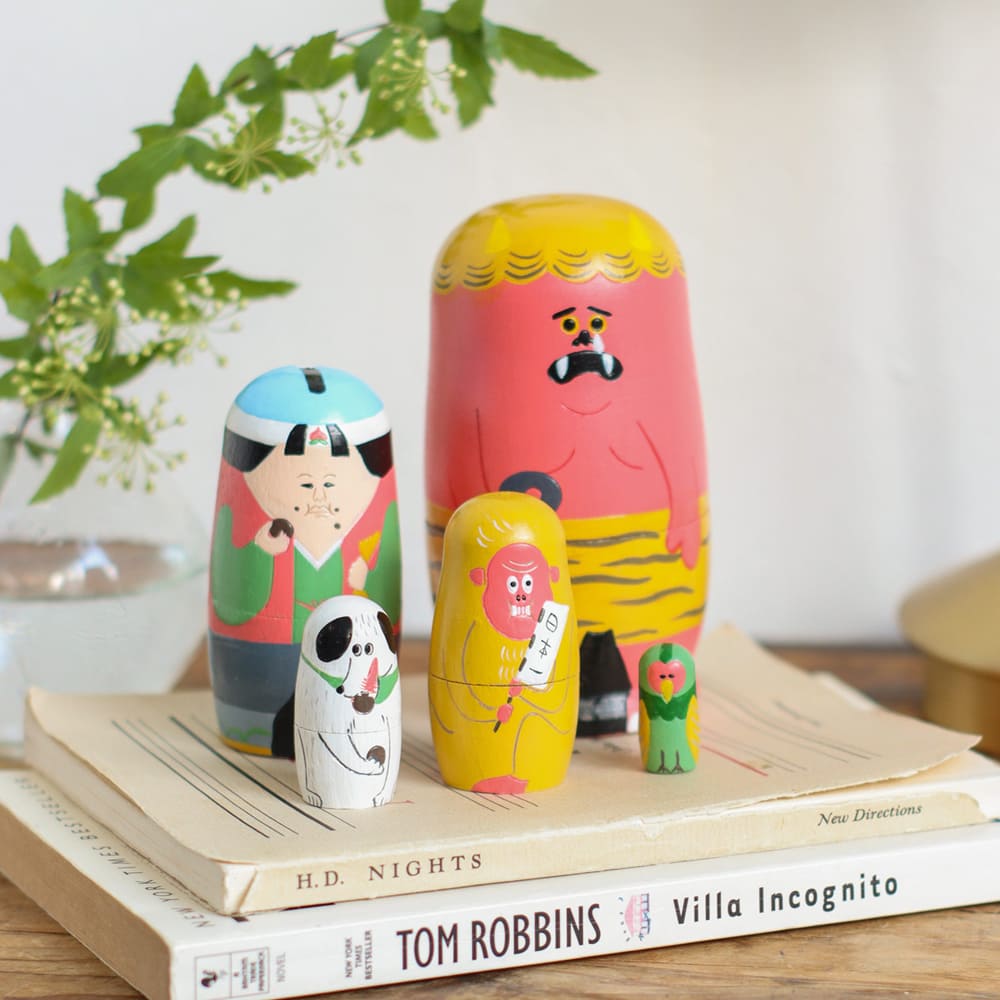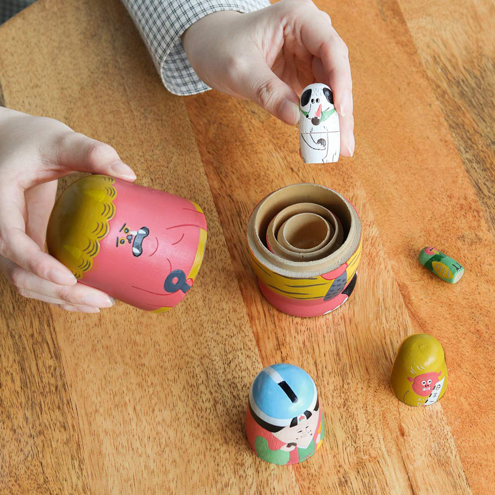 昔話「ももたろう」の登場人物たちが、カラフルでかわいい木製マトリョーシカになって登場。