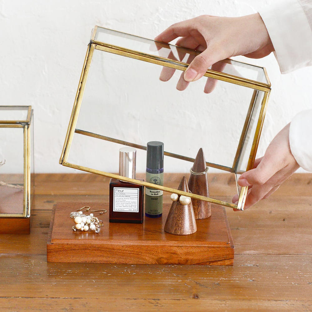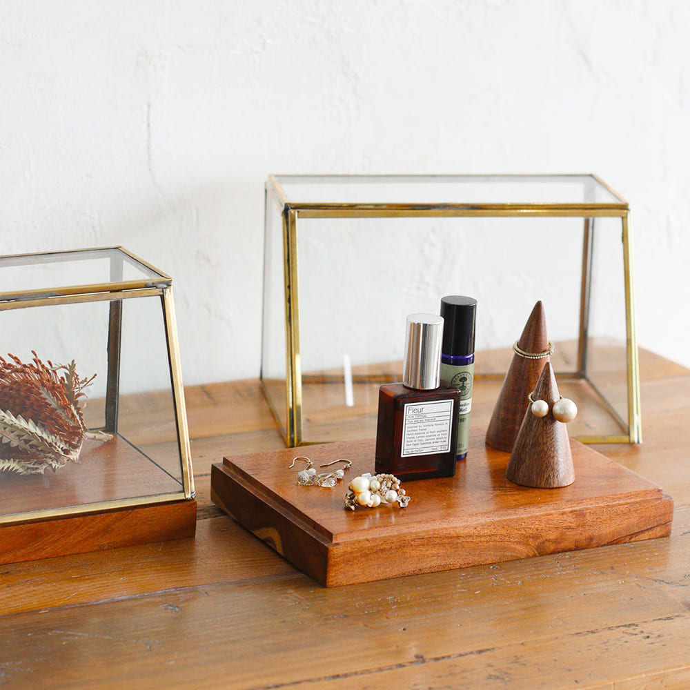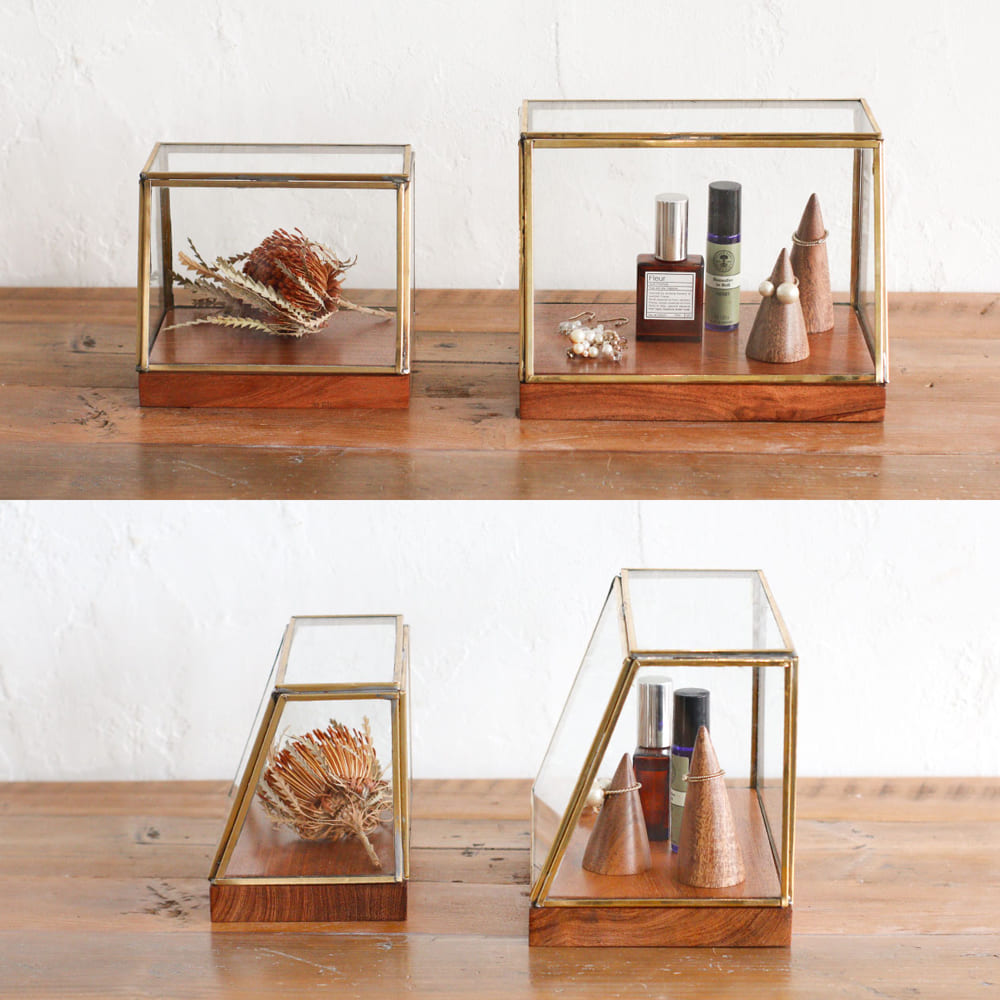 アンティークな雰囲気漂う『alten(アルテン)ブラスショーケース』は、ゴールド色の真鍮フレームとアカシア天然木の台座を組み合わせた上品なデザイン。