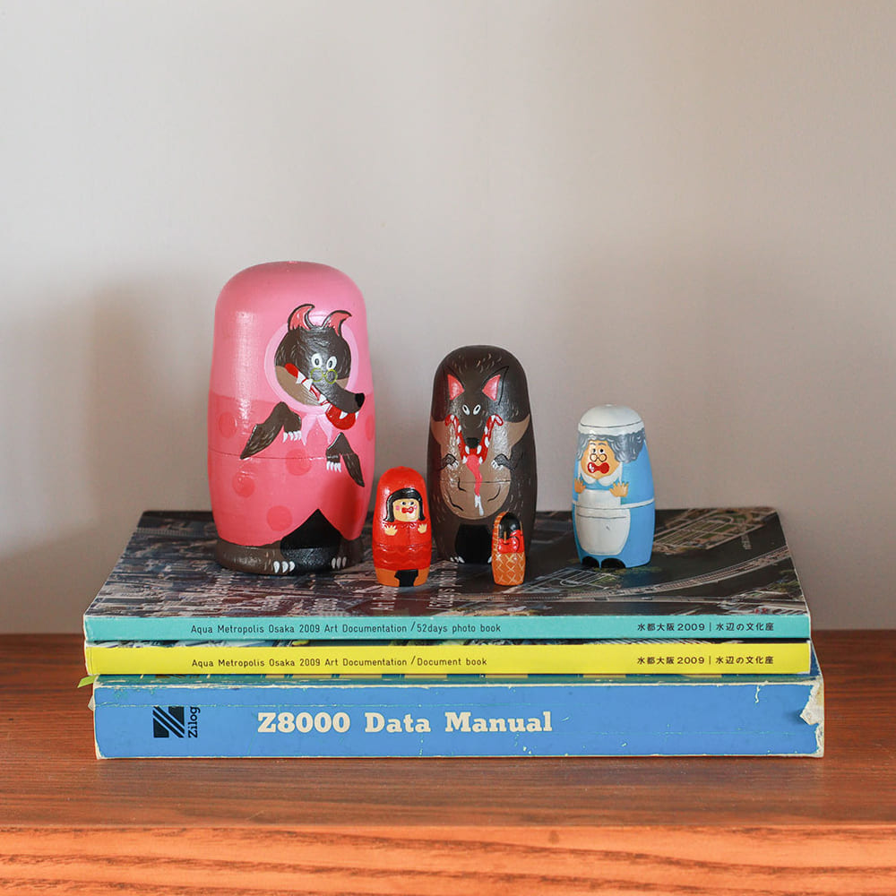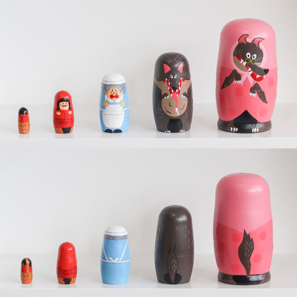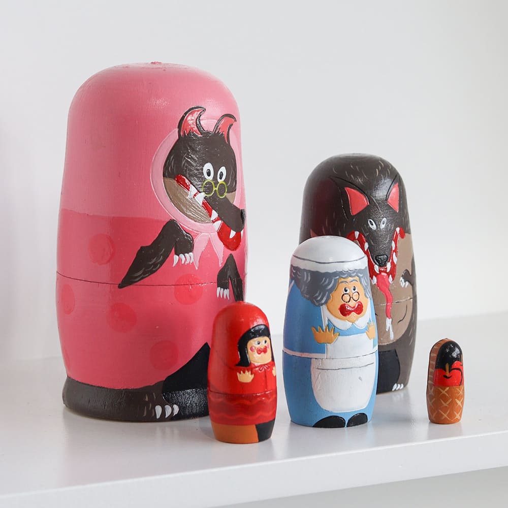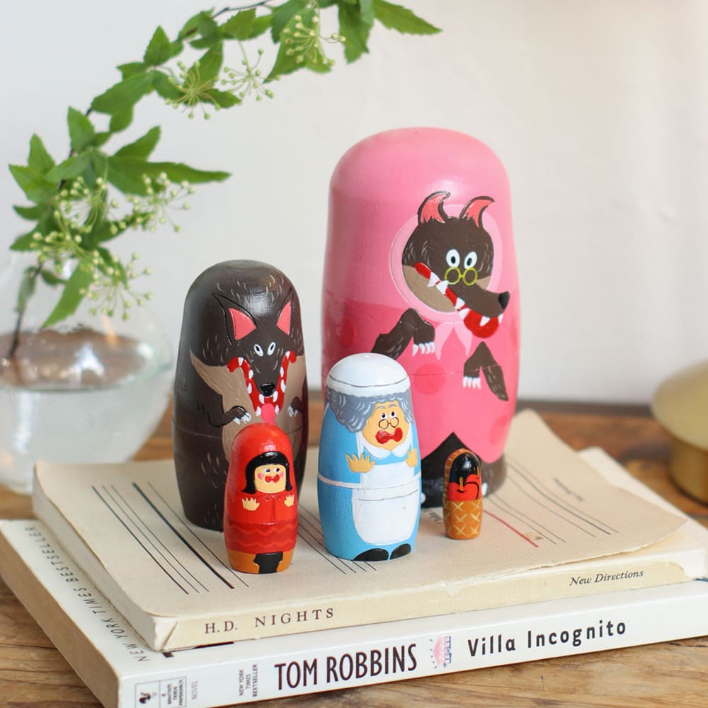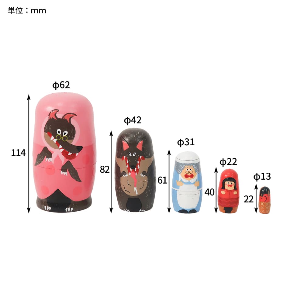 昔話「赤ずきん」の世界をそのままギュッと詰めこんだ、かわいらしい木製マトリョーシカ。