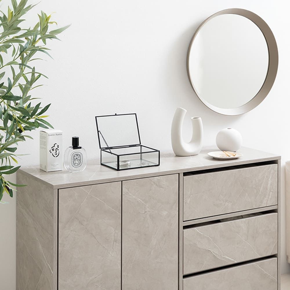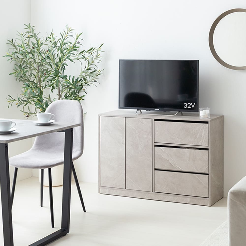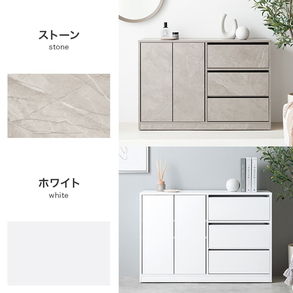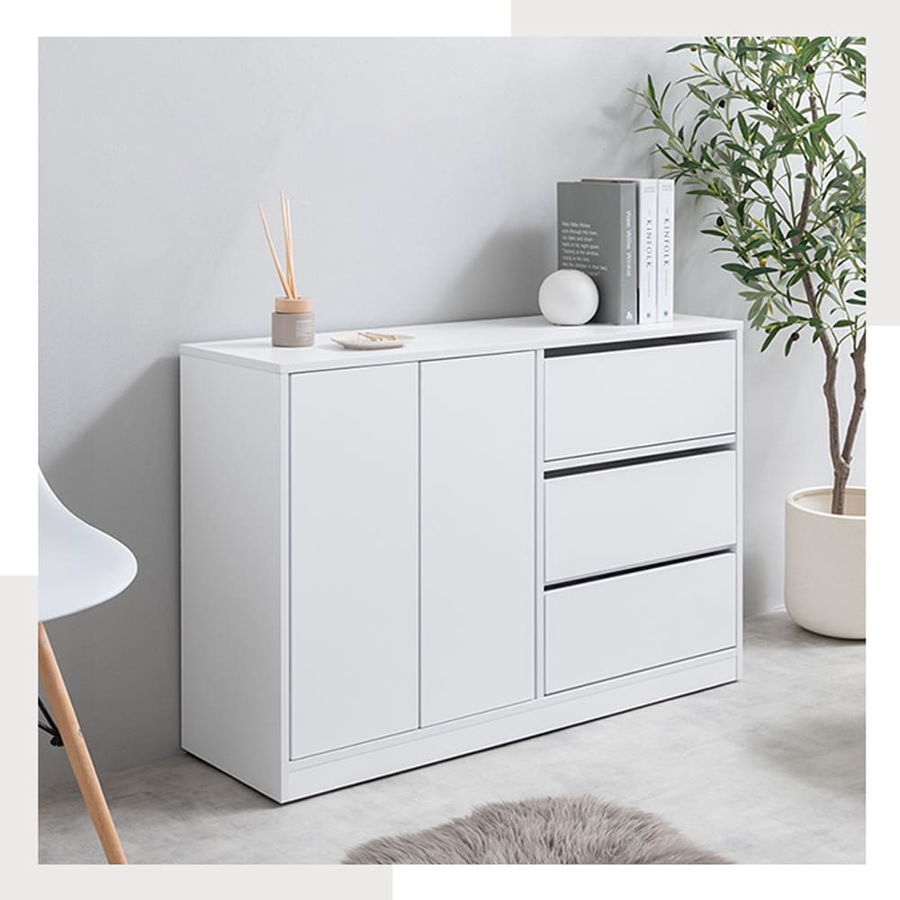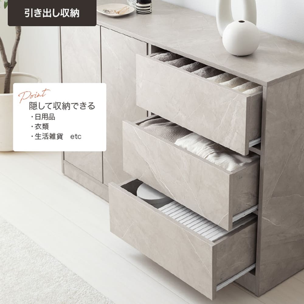 コンパクトな見た目ながら、2枚の可動棚付きの扉収納と、たっぷり収納できる3杯の引き出しを備え、生活感の出やすい日用品や雑貨をしっかり隠してくれます。
