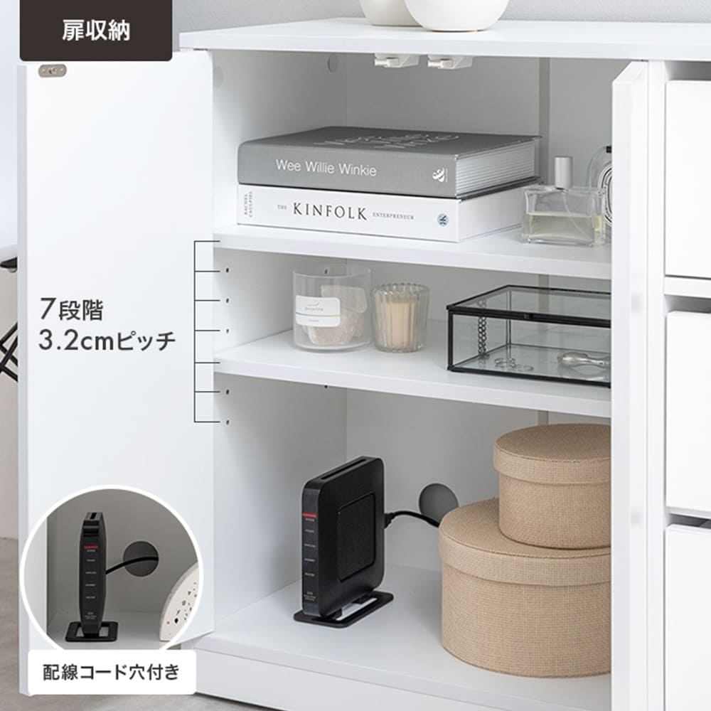 また下部には配線コード穴を設置しており、ルーターなど生活感のある機械類を隠して収納することが可能です。