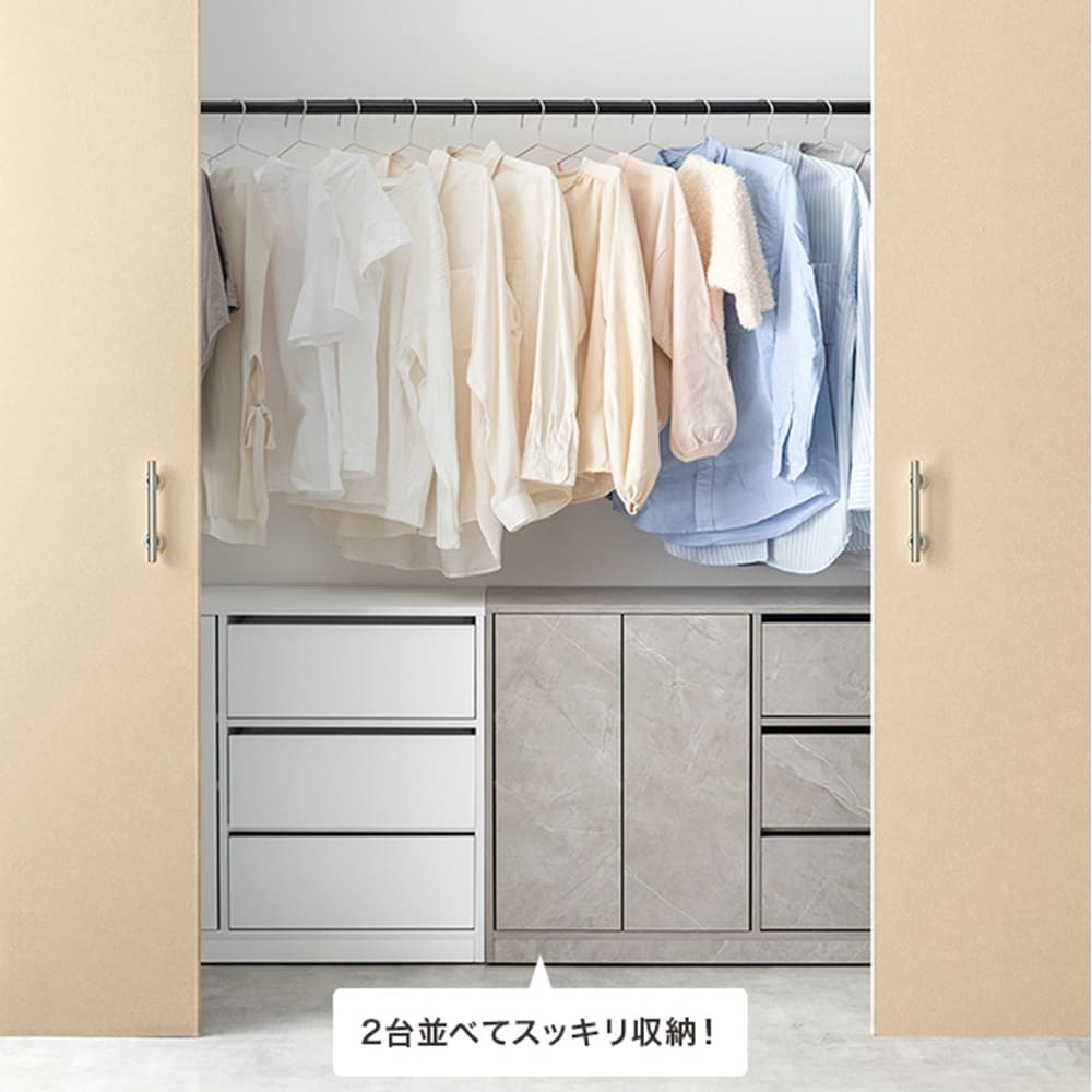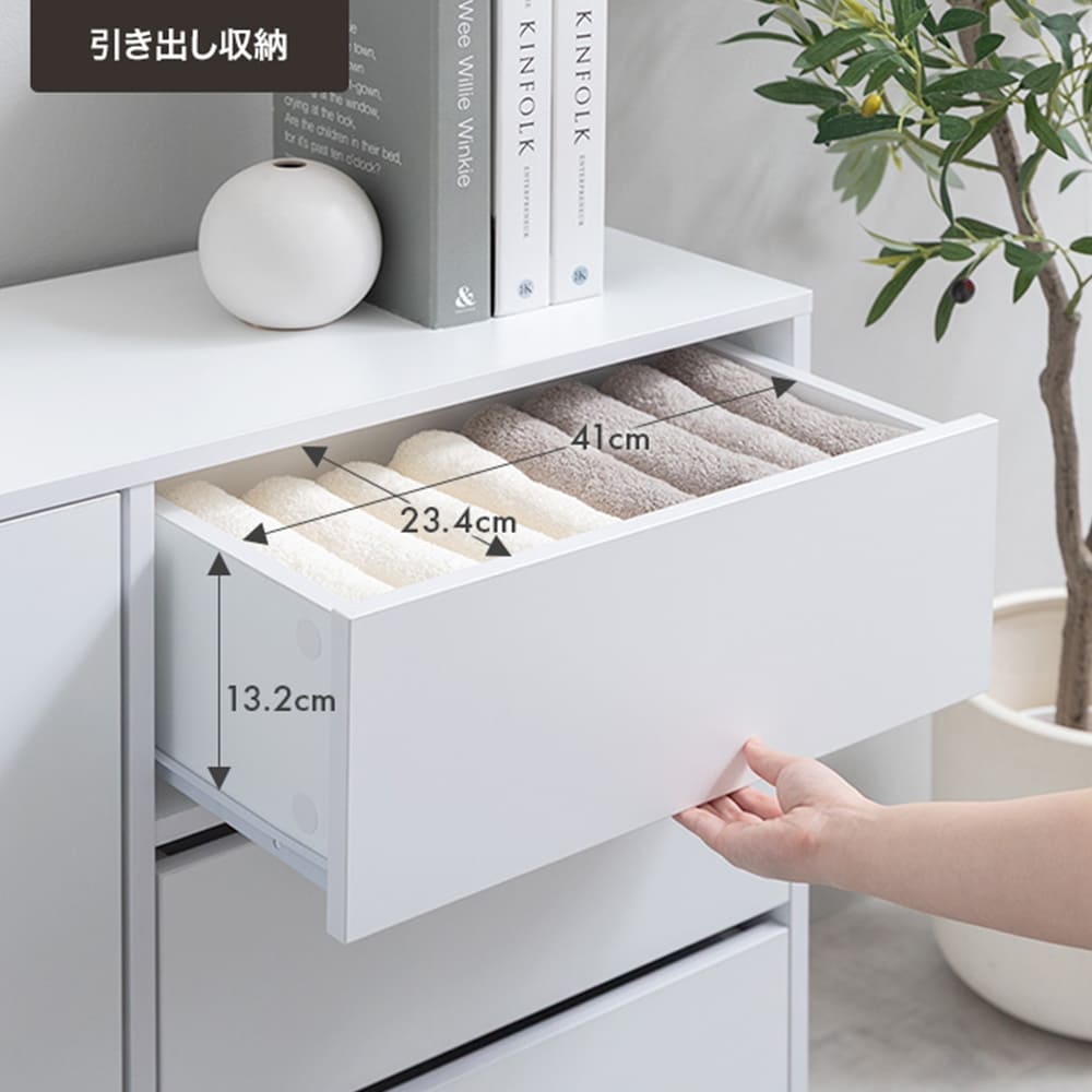 可動棚付きの扉収納とたっぷり入る3杯の引き出しは雑多な生活感を隠し、お部屋をすっきり演出。
