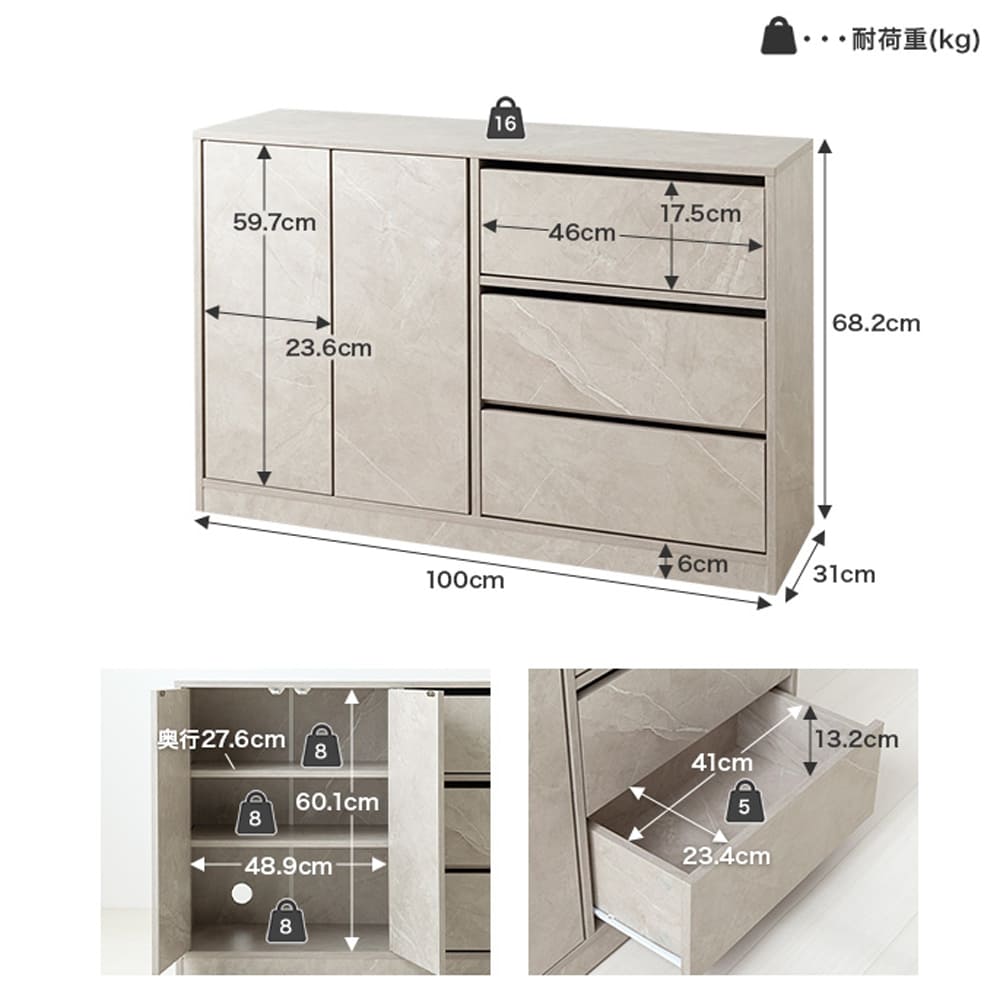 | サイズ(約) | 本体サイズ: 幅 100cm × 奥行 31cm × 高さ 68.2cm 商品重量: 約29kg 耐荷重: 天板 約16kg 、引き出し 約5kg、可動棚 約8kg 、扉収納内底板 約8kg |