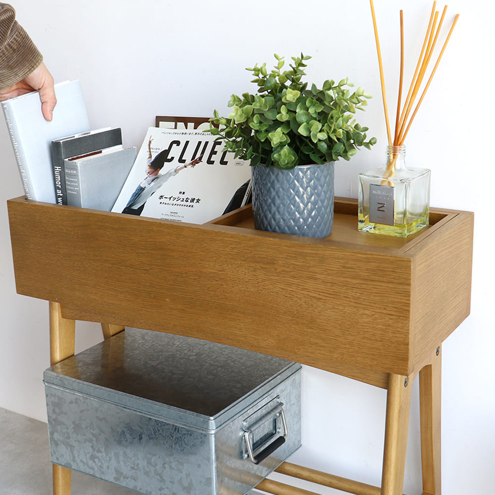 上部には雑誌や小物、植物などをおしゃれにディスプレイでき、収納とインテリアの両方を楽しめるのがポイント。