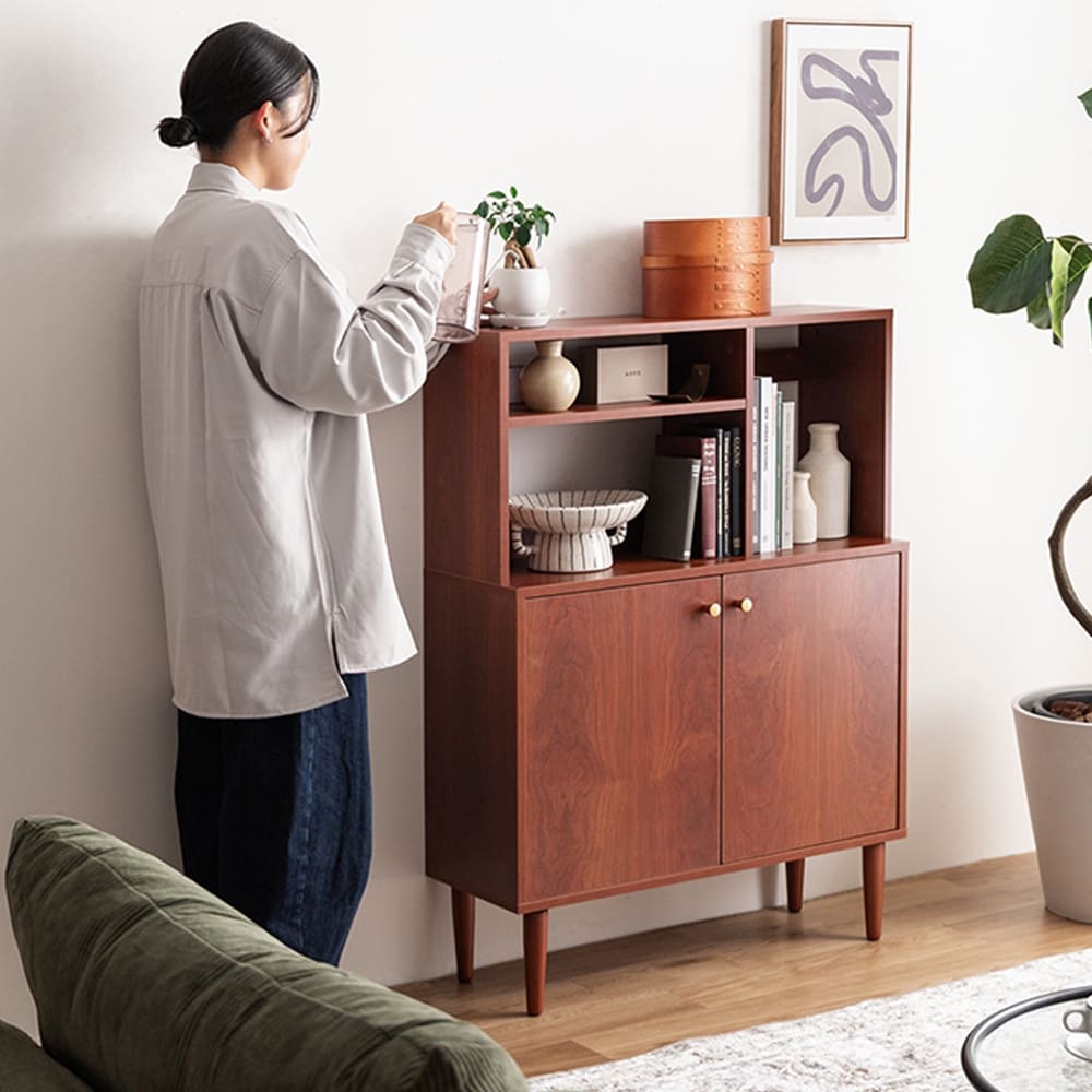 深みのある木目とすっきりしたフォルムが美しく調和する、本棚付きキャビネットPrime(プライム)。