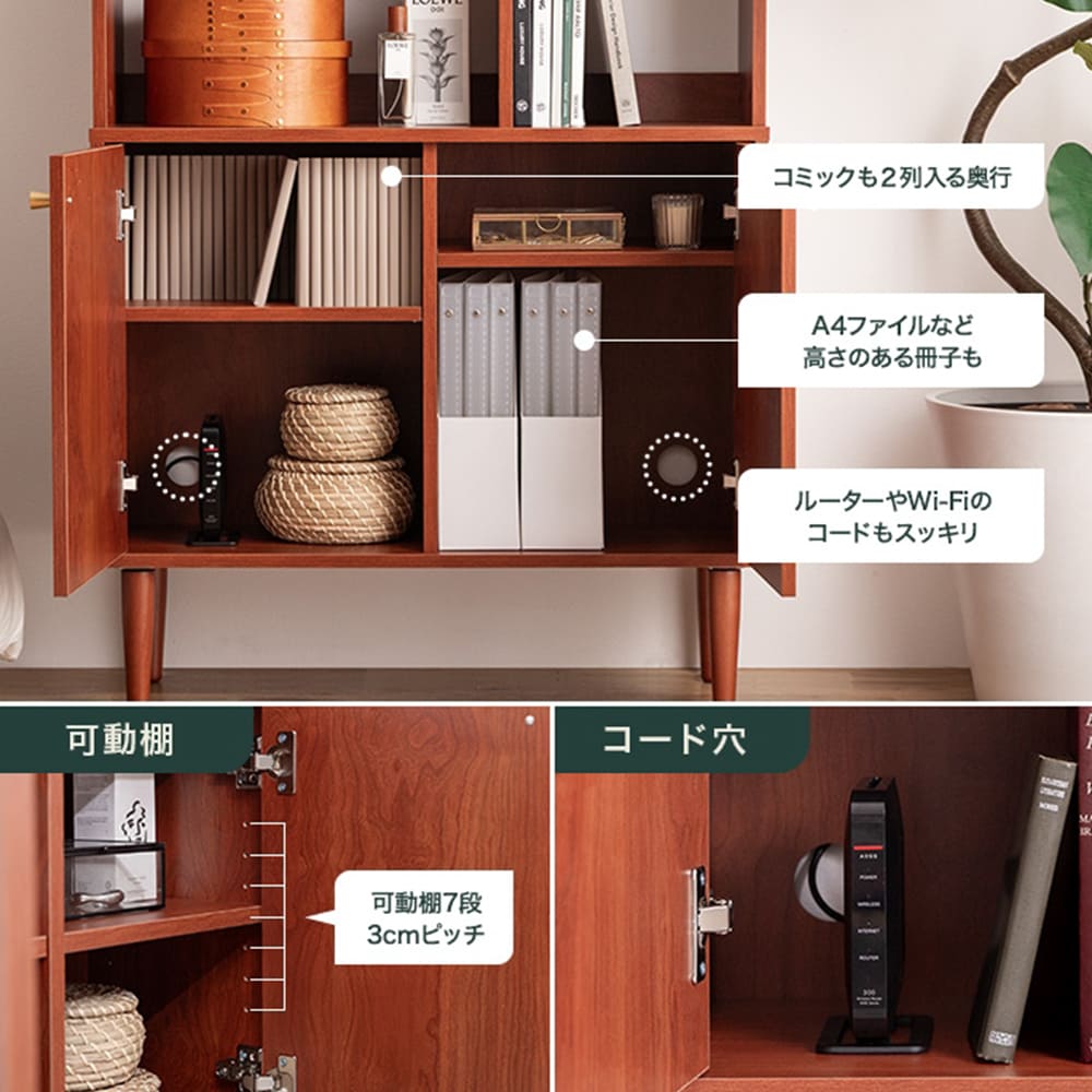 背面にはコード穴もあり、ルーターや小型家電の収納にも最適。