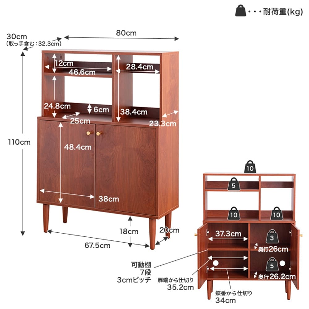 | サイズ(約) | 本体サイズ: 幅 80cm × 奥行 30cm × 高さ 110cm 商品重量: 約26.9kg 耐荷重: 天板 約10kg、オープン収納(棚) 約5kg、オープン収納 約10kg、可動棚板 各約3kg、底板 各約5kg |