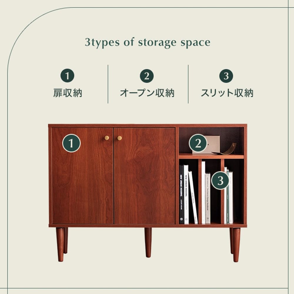 収納は「扉収納」「オープン収納」「スリット収納」の3タイプ。