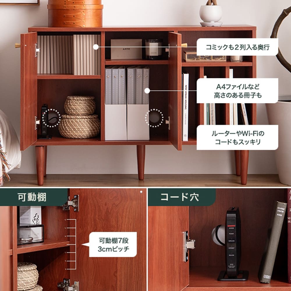 さらにコード穴もあるので、ルーターやWi-Fi機器の収納にも便利です。