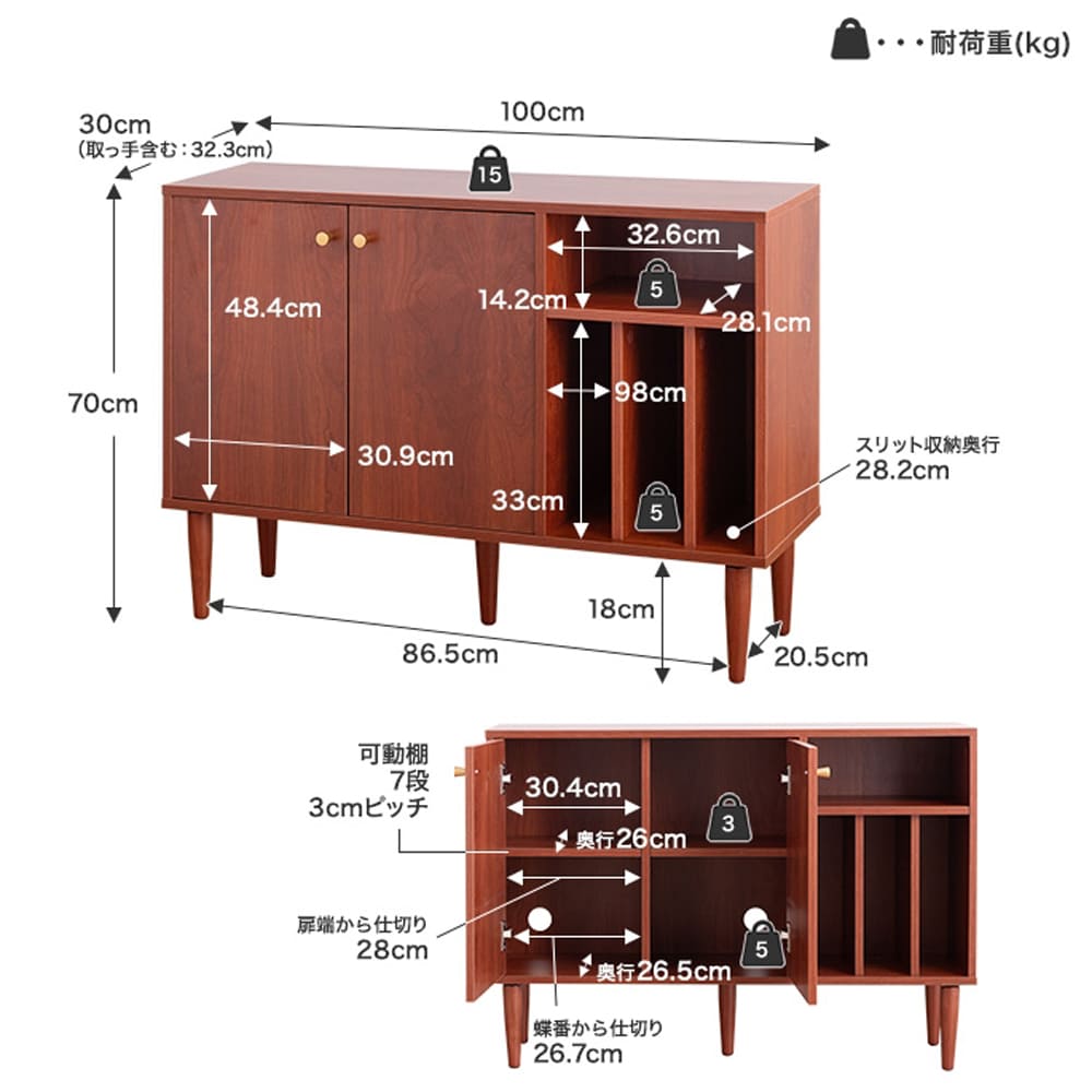 | サイズ(約) | 本体サイズ: 幅 100cm × 奥行 30cm × 高さ 70cm 商品重量: 約24.3kg 耐荷重: 天板 約15kg 、可動棚板 各約3kg、底板 各約5kg、オープン収納 約5kg、スリット収納 各約5kg |