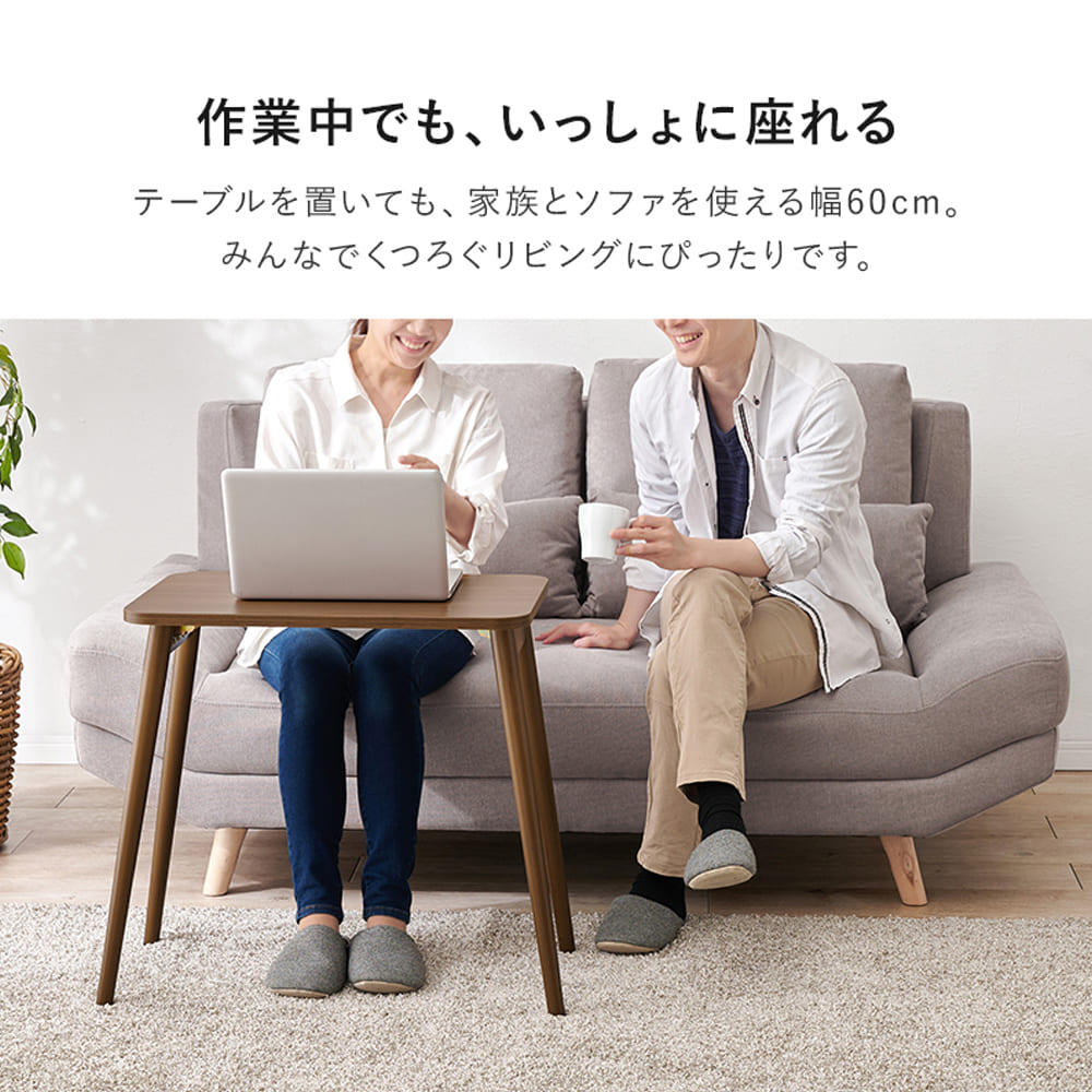 高さ60cmに設計されているためソファに座ったまま自然な姿勢で作業でき、前のめりにならず疲れにくいのが大きな特徴。