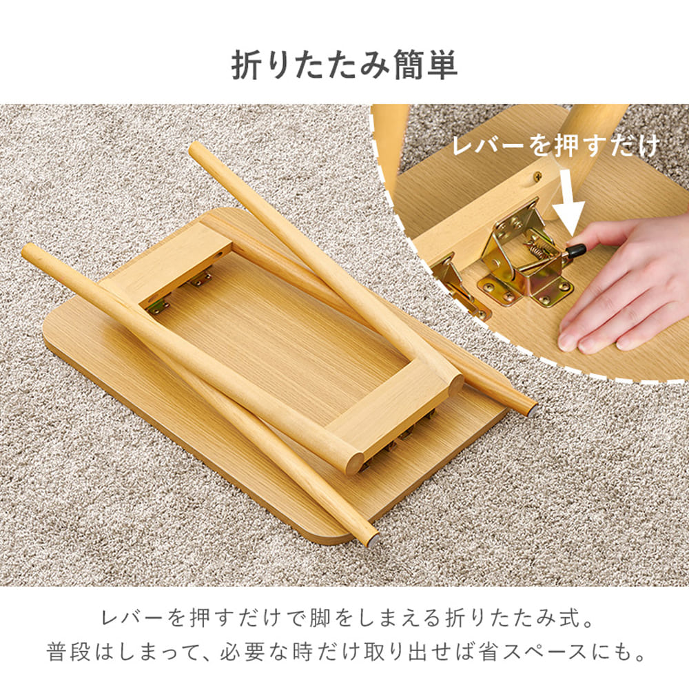 さらに脚はレバーを押すだけで折りたためる仕様。使わない時は厚さ約13cmとコンパクトになり、ソファ下や家具のすき間など、ちょっとしたスペースにも収納できます。