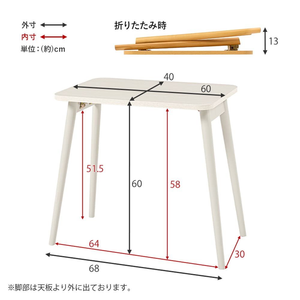 | 素材 | 天板:合成樹脂化粧繊維(メラミン)、脚部:天然木(樺材) |