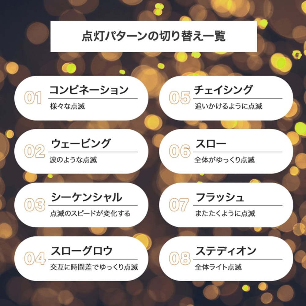 シーンに合わせて楽しめる8つの点灯パターン