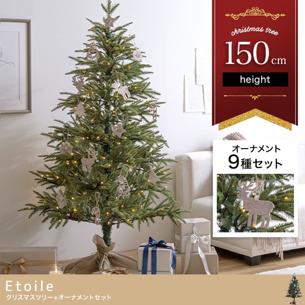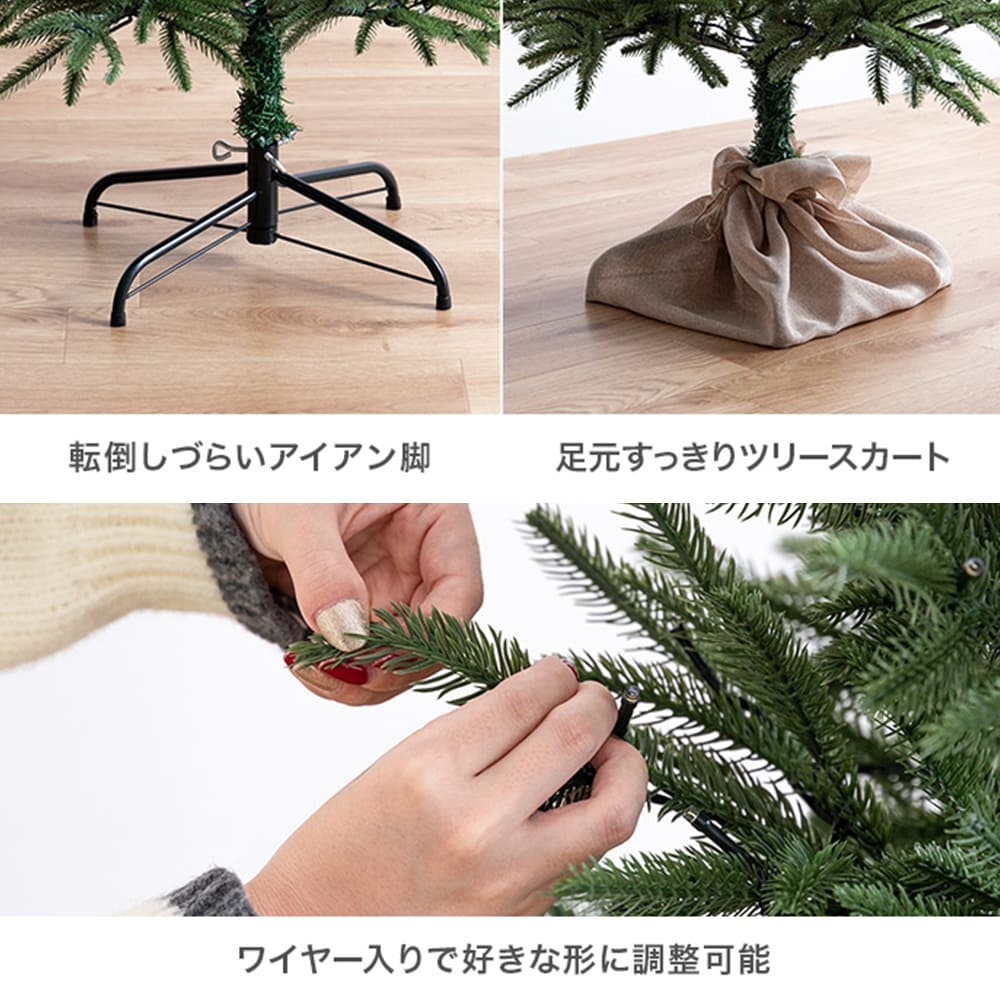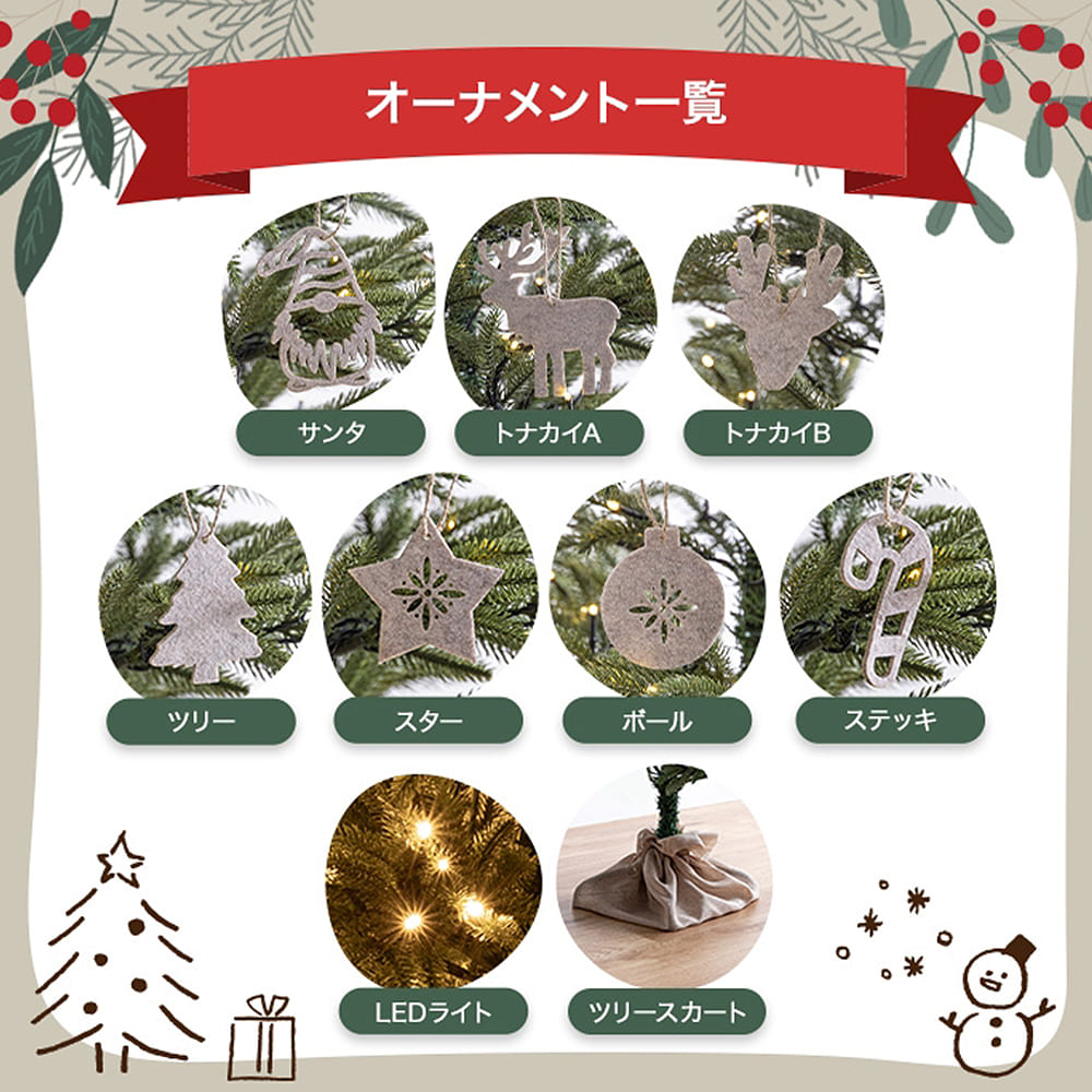 | 備考 | 組立品 ※組み立て時間:1人以上で約5分(飾り付け時間除く) ※組み立て工具は不要。 【付属品】 ・LEDライト1セット(電球の数:250灯) ・ツリースカート1セット ・フェルトオーナメント14点 ※商品の色味に関してましては、できる限り実物に近くなる様に努めておりますが、ご利用のモニターやデバイスの発色によりまして、実物と異なって見える場合がございます。 |