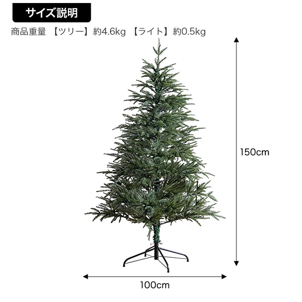 | サイズ(約) | サイズ : 幅 100cm x 奥行 100cm x 高さ 150cm 重量 : ツリー本体 4.6kg、LEDライト 0.5kg、フェルトオーナメント : 35g |